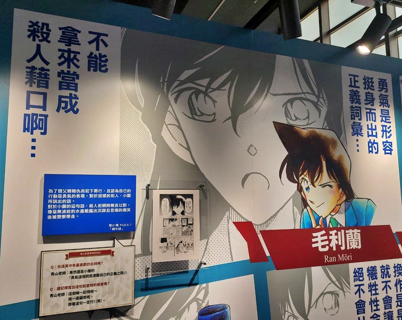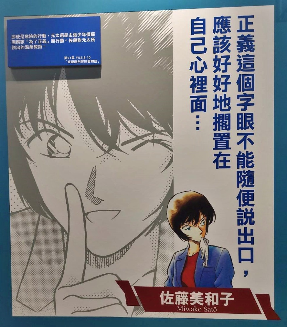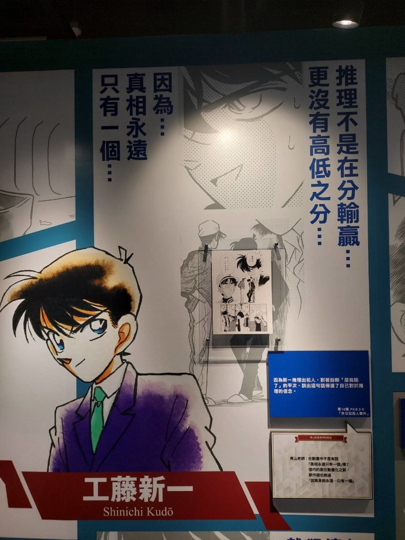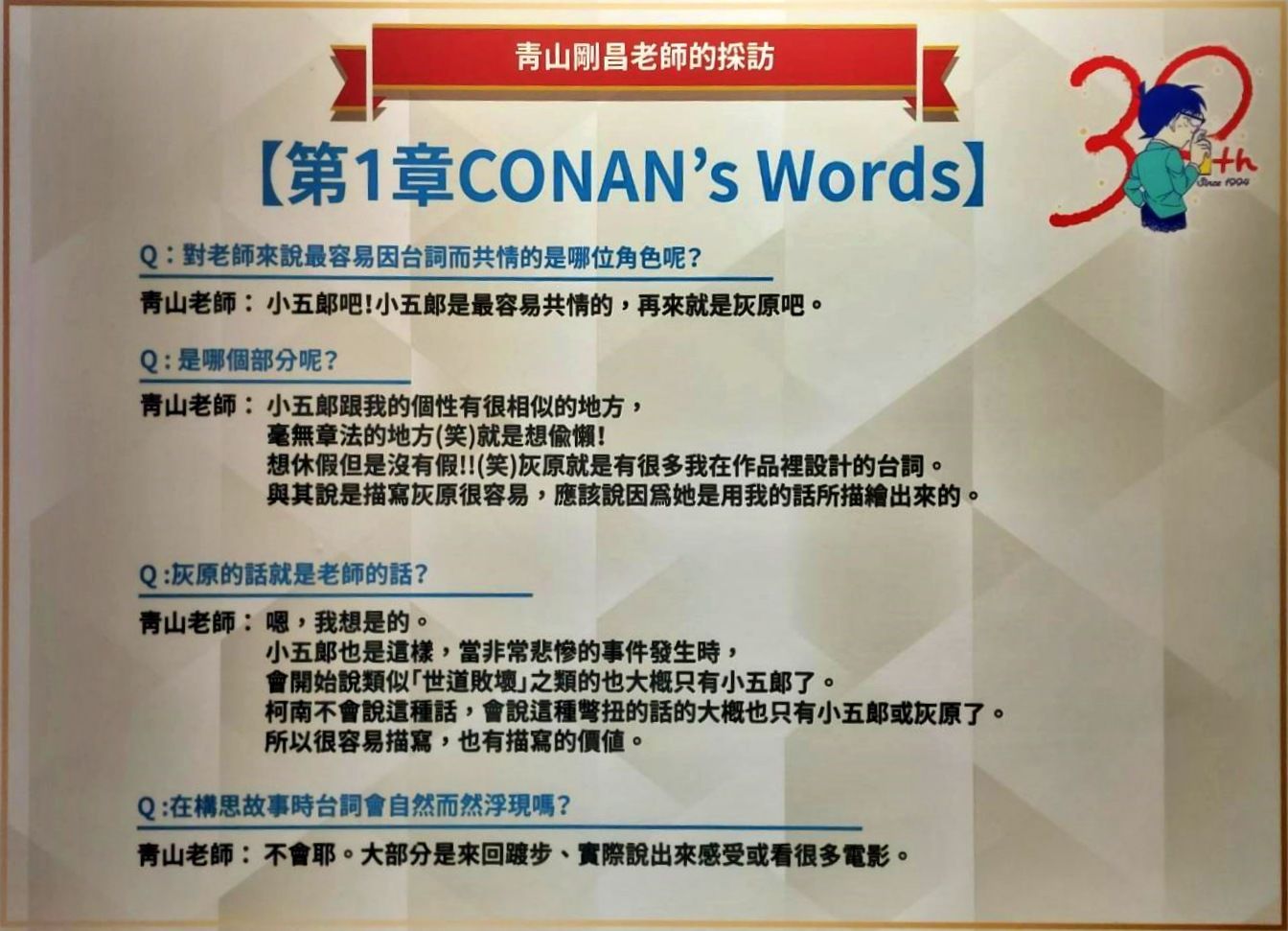 第一個展區「CONAN's Words」以特別摘錄的角色名言,讓大家想起每個事件中都有那麼一或兩句話相當打動人心,也藉此開始挑起每位讀者對於《名偵探柯南》劇情的回憶。其中「青山剛昌老師的採訪」內容,可在最後一個展區中看到影片版!但在前頭先藉由展版想像一下青山老師在對談時的風采吧。