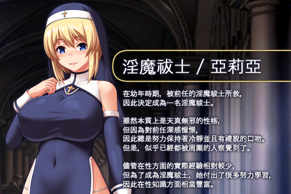 故事講述由於淫魔的詛咒,會讓性慾失控並且最終化為魔物的「淫魔病」蔓延了開來。而最神聖也最純潔的修女們,理所當然要幫受到疾病困擾的男性們解決慾望。女主角「亞莉亞」是由教會選出專門對抗淫魔病的新上任修女,人稱「淫魔祓士」的她必須經過重重試煉前往大神殿獻上祈禱,拯救這個世界。