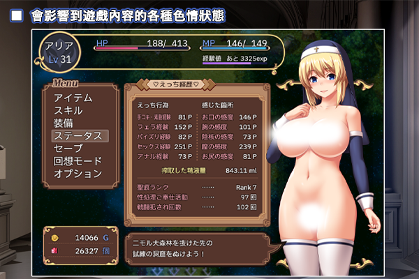 本作搭載了特殊戰鬥(戰鬥中性愛)並有部分動態瑟瑟及配音,除此之外擊敗敵人還會掉落可以製作特殊裝備的「經魔結晶」,在遊戲中實現煉金裝備以及扭蛋系統,如果一開始就運氣好抽到 SSR 或 LR 等級,爽爽通關不是夢!