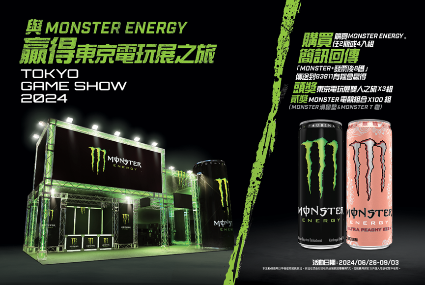 即日起至9/3(二)23:59止於各大通路購買Monster Energy全系列任一口味兩瓶或四入組,即有機會抽中「日本東京電玩展雙人之旅」(1名得獎者+1名同行人員,參考市值NT50,000)!幸運得主將享受四天三夜暢遊日本,親身體驗亞洲最大電玩展的無限魅力和能量!千萬別錯過這個絕佳機會,趕快行動,讓Monster Energy 帶你飛往東京,享受亞洲最大的遊戲盛宴!