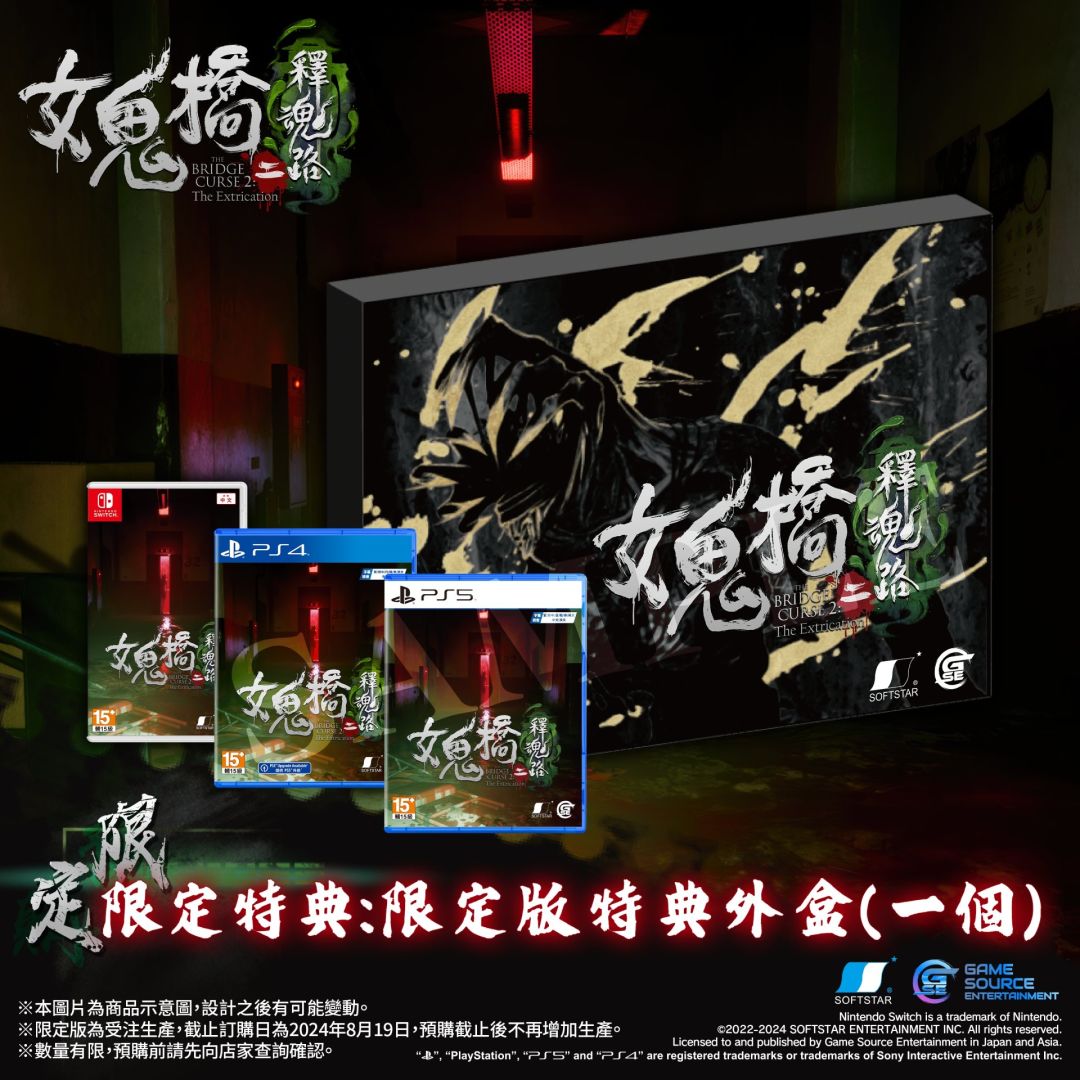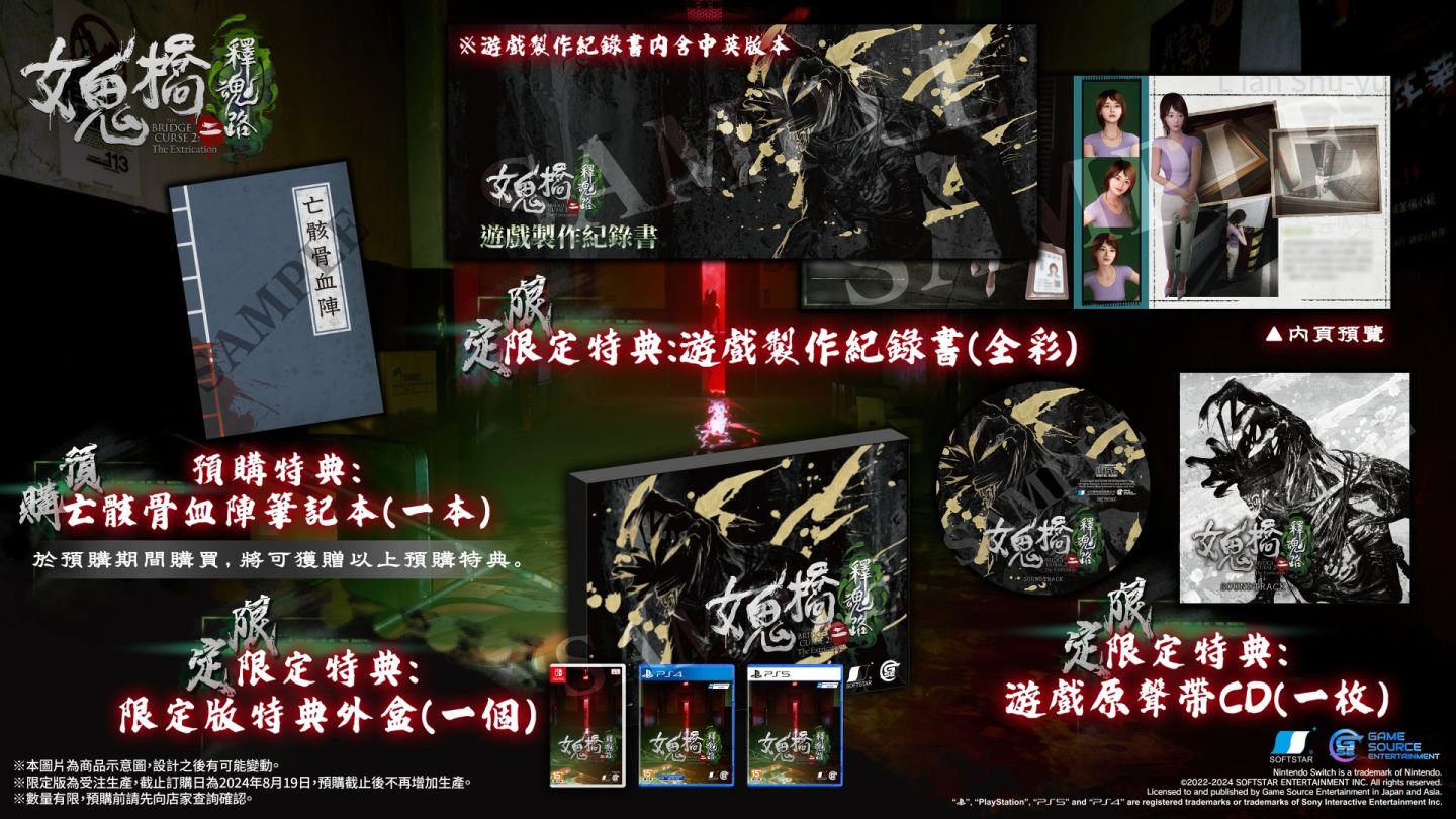 Game Source Entertainment(GSE)宣佈,由大宇資訊研發,改編驚悚電影《女鬼橋》恐怖遊戲續作《女鬼橋二 釋魂路》,預定於 2024 年 10 月 24 日於 Nintendo Switch、PS4、PS5 推出數位版及實體版(普通版/限定版);Xbox One 及 Xbox Series X|S 平台則會推出數位版,並由 GSE 負責亞洲及日本區的主機發行。今天為各位玩家帶來《女鬼橋二 釋魂路》亞洲實體版的預購特典,遊戲限定版的豐富特典內容亦首度公開!