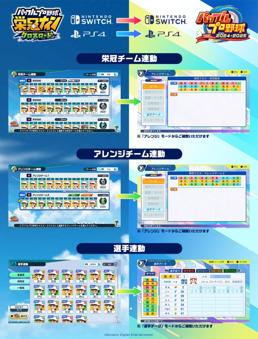 同時官方也宣佈,這次的 Switch/PS4 家機版還將會支援與 7 月 18 日發售的《實況野球 2024-2025》(パワフルプロ野球2024-2025)之間的記錄存檔連動。兩款遊戲只要是相同平台(例如都是 PS4 版或都是 Switch 版),就能將自己在《實況野球 榮冠9 Crossroad》中登錄的「榮冠球隊」、「改編球隊」、「選手」等資料連動到《實況野球 2024-2025》中(選手最多 70 人、榮冠球隊與改編球隊則是各一隊),讓玩家屆時可以使用自己培育的強隊來進行遊戲挑戰。
