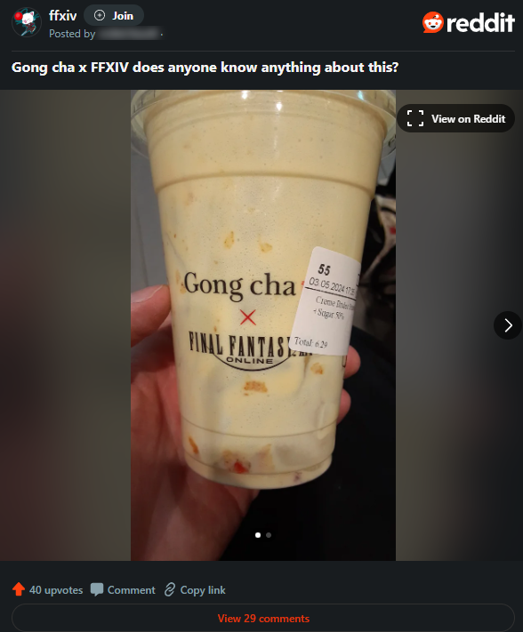 「貢茶 x Final Fantasy」限定期間聯名新品是在官方直播「製作人直播 Part 82」當中,由遊戲總監吉田直樹宣佈的多項合作活動之一。與台灣發跡並在全球有多家珍珠奶茶連鎖店的「貢茶」合作,在合作期間,前往日本、北美、歐洲、大洋洲的玩家,可以購買三杯以上的飲品,獲得特殊座騎序號,此外杯子也將有特殊的《FF14》角色杯設計,活動將從 7/17 ~8/28 日止。