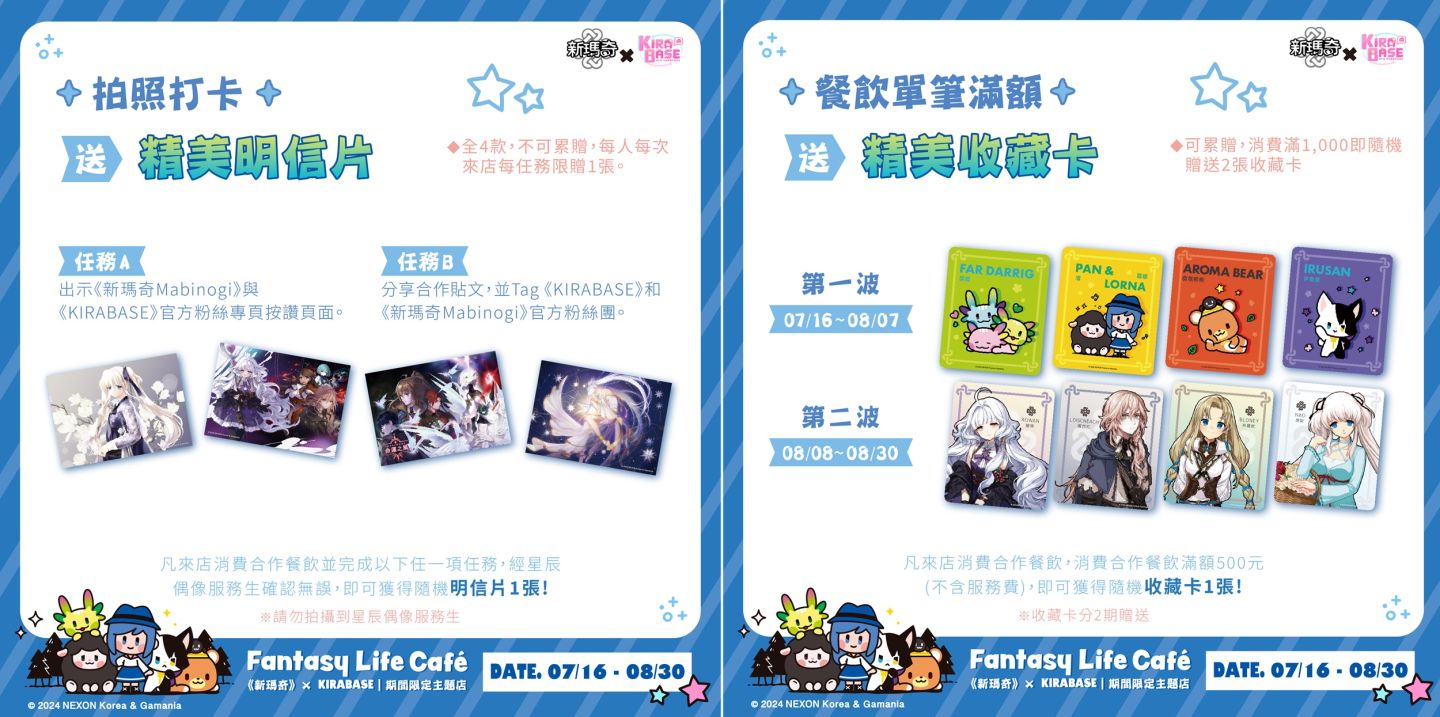 除了可以在《新瑪奇》經典角色圍繞的環境享用特製餐點外,還有限量精美好禮及專屬任務等待玩家解鎖!只要來店用餐即贈精美特典,購買合作餐點將隨機附贈餐插牌、紙杯墊、紙吸管套;而消費滿NT$500更加贈精緻收藏卡乙張,活動可累贈,共計8款卡面等玩家來蒐集!此外,完成現場任一專屬拍照打卡任務,還能再獲得精美明信片乙張,共計四款,每一款都超級好看!