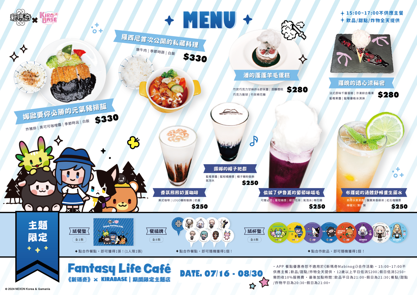 主題店以人氣角色娜歐、蘿晚、羅西尼、伊魯夏、香氛熊熊、潘、露娜、露露為設計主軸,並結合角色的特質與喜好,特別打造2款主餐、4款飲料以及2款甜點等極具特色的專屬餐點,好看又好拍!特製餐點如下: