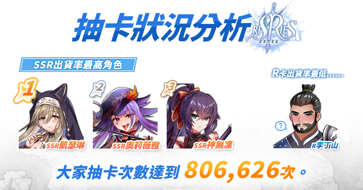 遊戲內各具風姿的美少女那麼多,忍不住又點下抽卡的按鈕了!截止至菁英封測結束,大家的抽卡次數達到 806,626 次,平均每位玩家的抽卡次數為 183 次,其中出貨率最高的 SSR 角色前三名分別是:凱瑟琳、奧莉薇雅、神無凜,至於在指揮官中也擁有高人氣的 R 角色李丁山意外的是出貨率最低的角色。