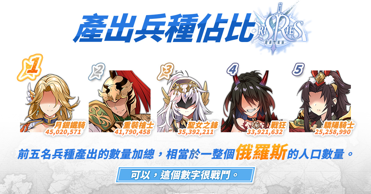 說完愛用的英雄角色,不免俗地要談談兵種的產出!在本次菁英刪檔封測活動期間,產出兵種佔比最高的前五名兵種,從第一名至第五名分別為:月銀鐵騎、重裝槍士、聖女之鋒、戰狂、驕陽騎士。值得一提的是,前五名兵種產出的數量加總,相當於一整個俄羅斯的人口數量。