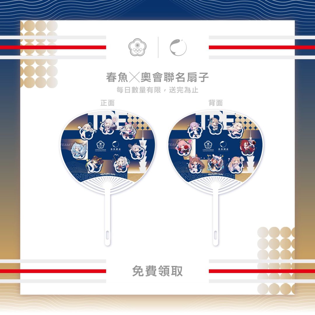 漫畫博覽會期間春魚創意攤位將推出春魚創意×中華奧會聯名的「T恤」、「運動毛巾」供粉絲購買紀念,此外活動期間每日還能免費領取聯名扇,數量有限送完為止。