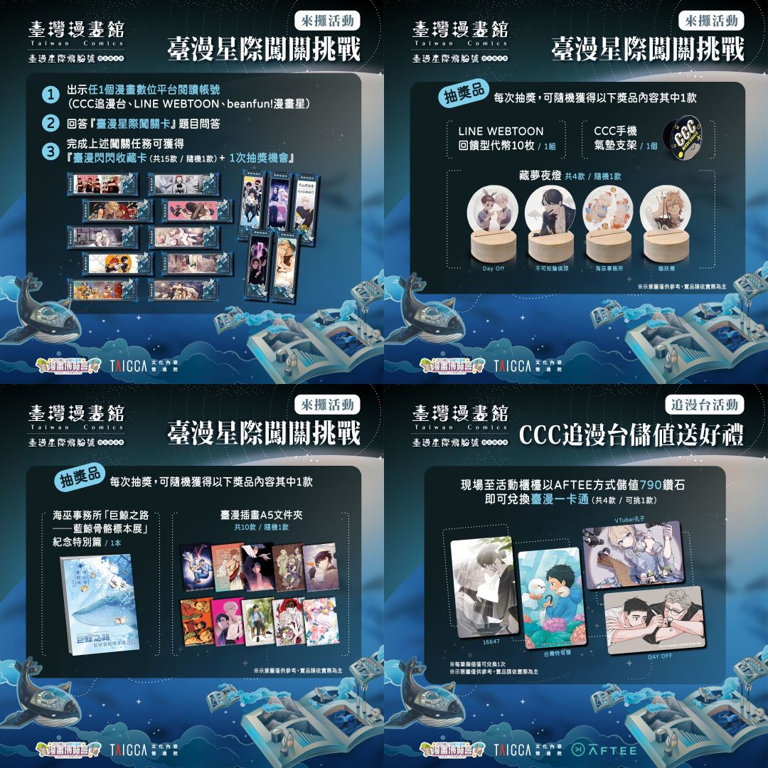此次的臺漫銷售區與誠品書店合作,現場可入手多部即將出版的新書,包含《王城綺事錄 3 完》、《向陽之戀 4》,以及曾獲第 13 屆金漫獎年度漫畫獎《貓妖傳 4》等。此外,由 CCC 追漫台孵育開發的《尋山人 (全)》、《吉花五號 3》將於漫博會當天首發,供漫迷搶先珍藏!現場除了結帳滿額贈多重好禮外,還有攤位闖關活動,參加者將有機會獲得臺漫閃閃收藏卡與 LINE WEBTOON 回饋型代幣 10 枚及豐富的漫畫周邊商品。此外,也歡迎觀眾憑漫博會門票至漫博贈品區攤位上兌換限量嗨嗨應援扇,共計 5 款設計可收集。