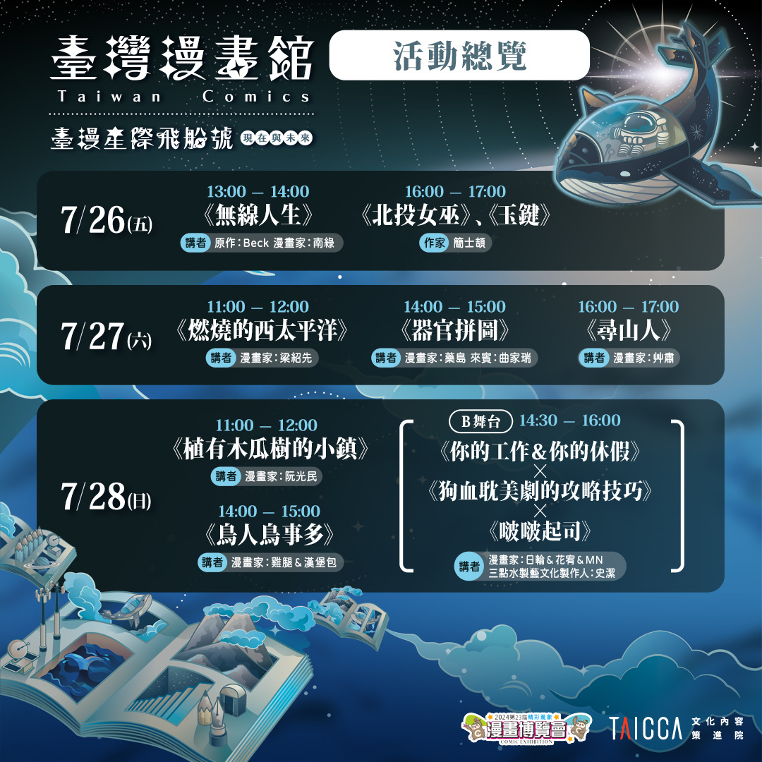 沙龍舞台將於 7 月 26 日至 28 日舉行,共帶來七場座談與新書簽名會。7 月 26 日,以 CCC 追漫台攜手鏡文學推出的《無限人生》漫畫打頭陣,漫畫家南綠與原作 Beck 將暢談小說改編漫畫的幕後秘辛。接著,LINE WEBTOON 超人氣 IP 《北投女巫》與《玉鍵》的作者簡士頡也將現身舞台,前 20 名參與簽名會的讀者將可獲得限定簽繪板。7 月 27 日上午將舉辦燎原出版的《燃燒的西太平洋》座談會,由漫畫家梁紹先分享創作點滴。下午則有鯨嶼文化出版的《器官拼圖》新書座談暨簽書會,漫畫家藥島將與嘉賓曲家瑞進行對談。台灣角川與人氣作者艸肅老師也將為其商業出道作《尋山人》舉辦簽名會,分享作品的創作背景與靈感。7 月 28 日,前衛出版社將攜手金獎漫畫家阮光民舉辦改編自經典臺灣文學《植有木瓜樹的小鎮》的漫畫版新書簽名會。時報出版的《鳥人鳥事多嘎嗚鳥家登場!》作者雞腿與漢堡包也將出席見面簽名會。