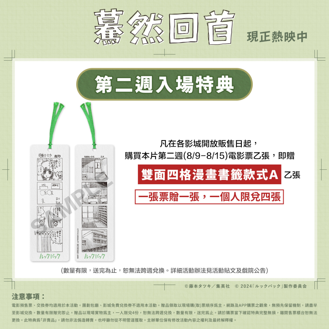 台灣片商乘勝追擊公佈本片「第二週入場特典」,只要在各影城開放販售日起,購買本片第二週(8/9~8/15)電影票乙張,即可獲得遠從日本原裝空運來台的「雙面四格漫畫書籤款式 A」乙張。每人每次至多限兌換四張,數量有限,送完為止。