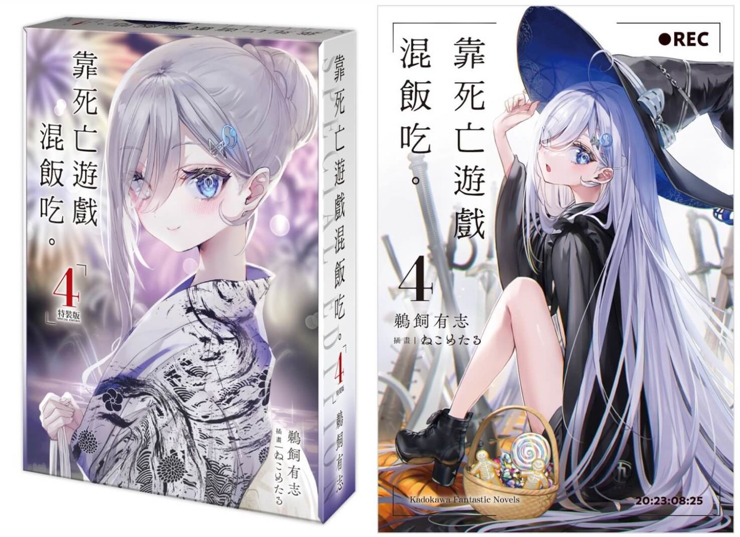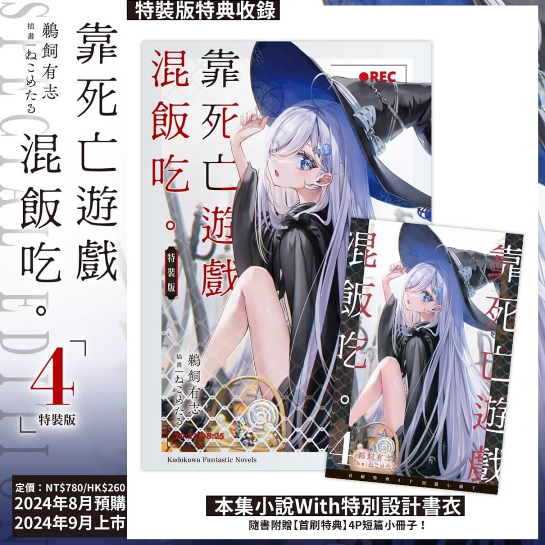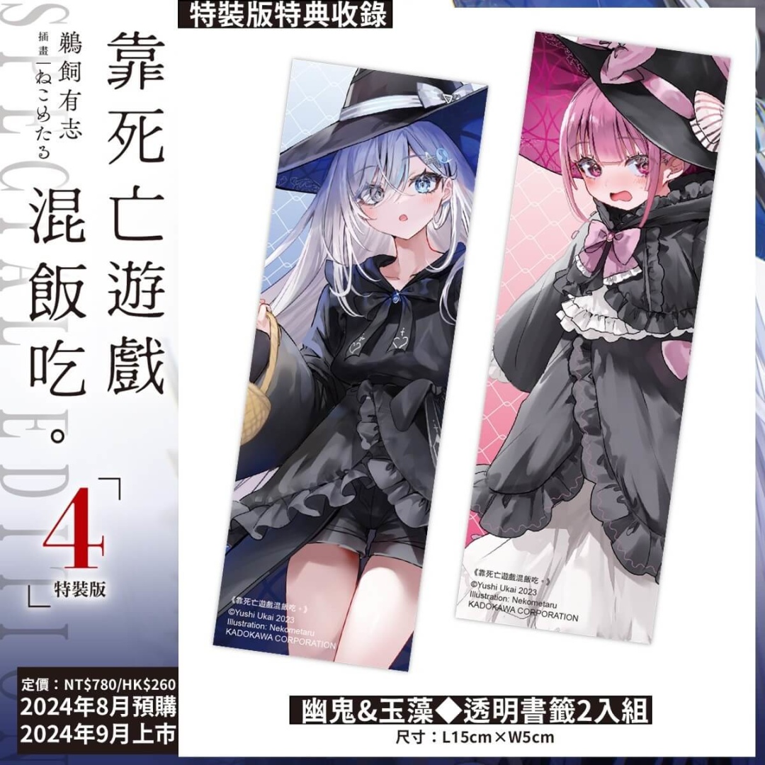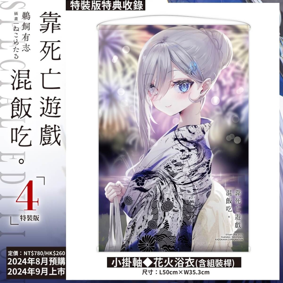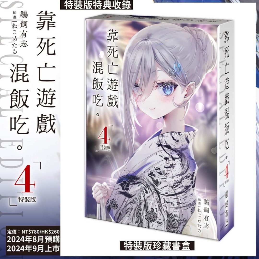 《靠死亡遊戲混飯吃。(4)》書封以「HALLOWEEN NIGHT」的糖果女巫造型的 JK 遊戲玩家「幽鬼」為主題,隨書附贈「首刷特典 4P 短篇小冊子」;特裝版以「特裝版珍藏書盒」收錄多款特典:小掛軸◆花火浴衣、幽鬼&玉藻◆透明書籤 2 入組。即日起於全台指定實體通路以及台灣角川官網開放事前預購至 8 月 19 日(一),預定九月底在台發售。凡於台灣角川官網完成特裝版預購,加碼贈送官網購物金 100 元。特裝版上市後數量有限售完為止,有興趣的讀者請把握預購期間,以免向隅。
