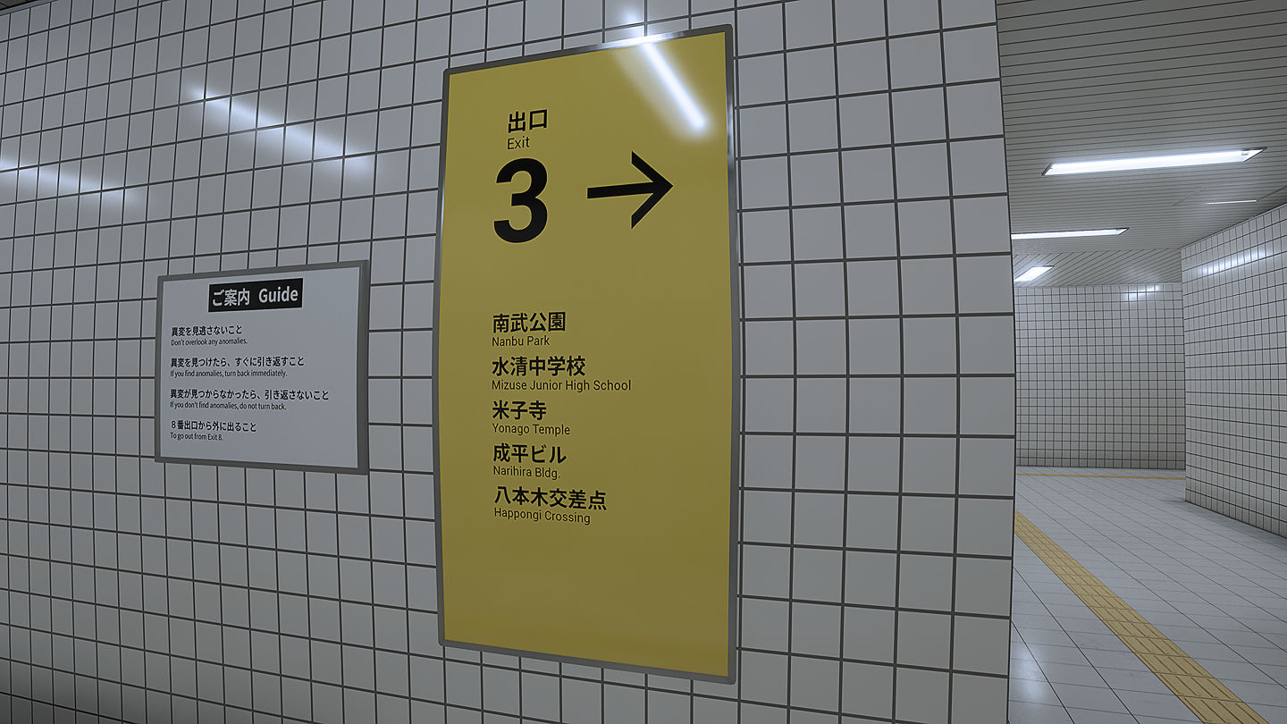 《8號出口》是一款以日本的地下通道、閾限空間、後室等等為靈感的短篇步行模擬遊戲。PC/Nintendo Switch 版在全世界取得了 100 萬下載量傲人成績。本作獨創的找出異變的遊戲玩法,也給同類型作品帶來了深遠的影響。