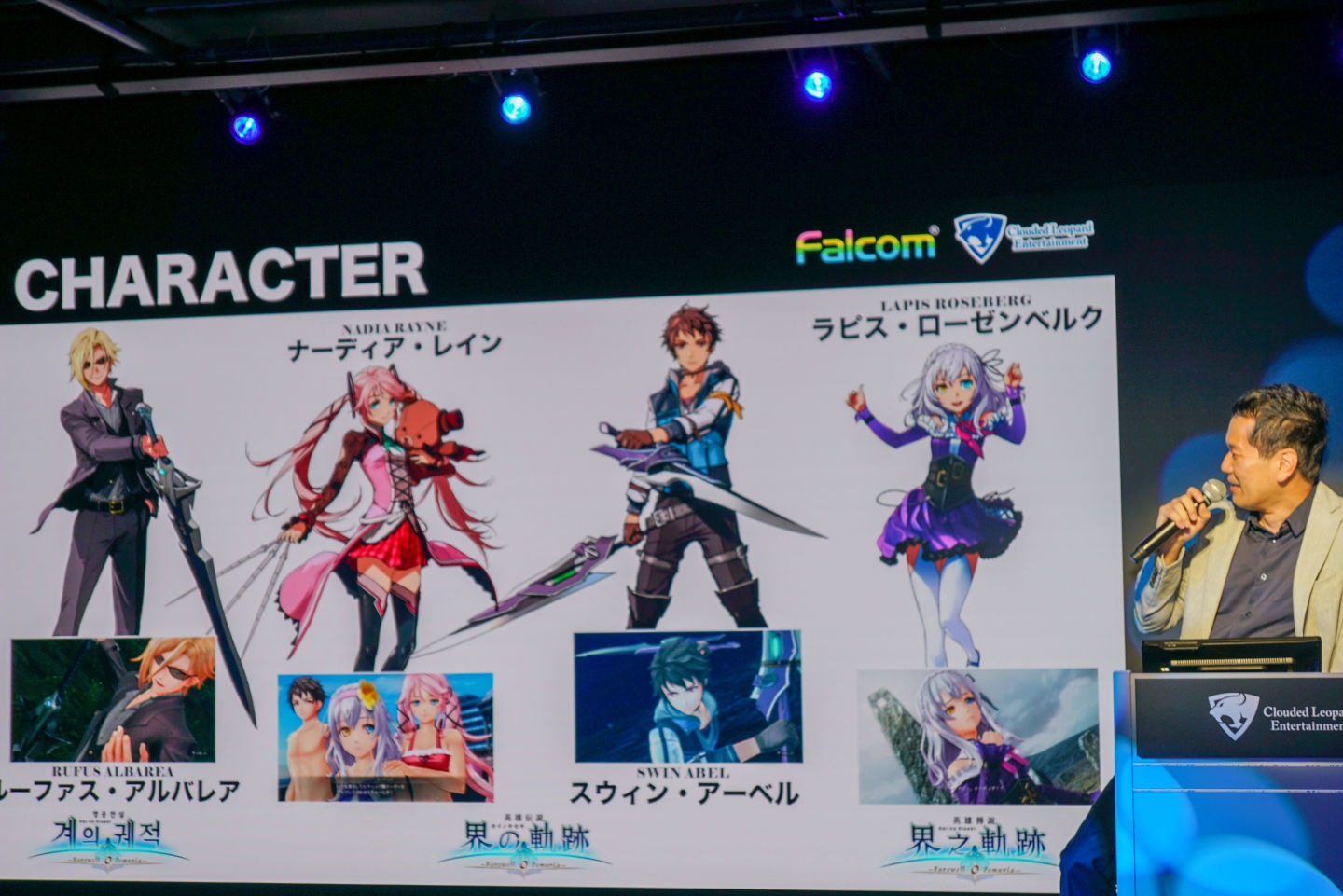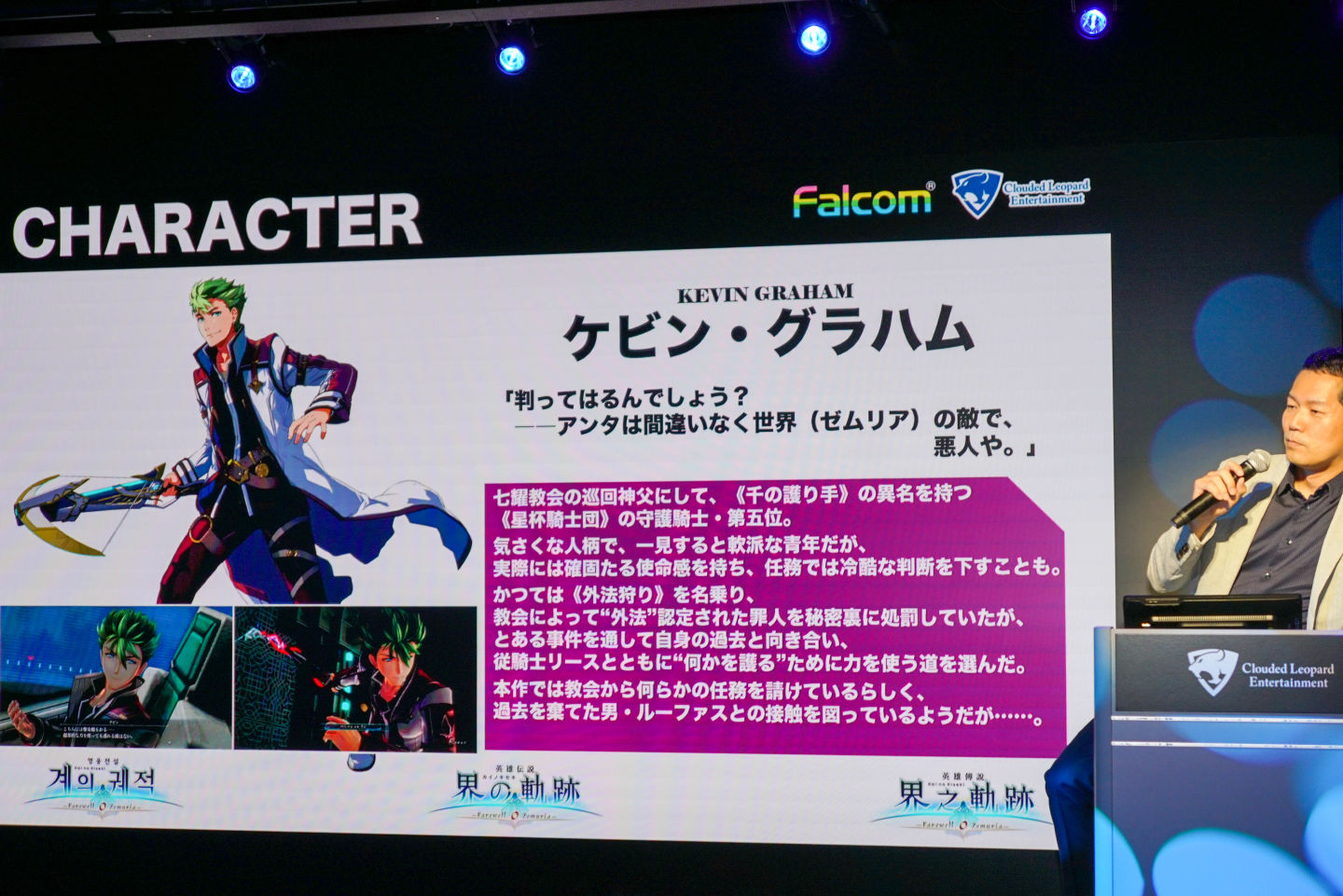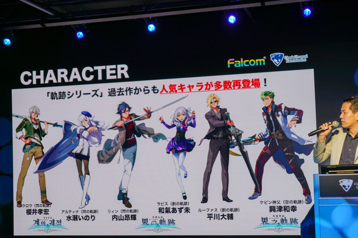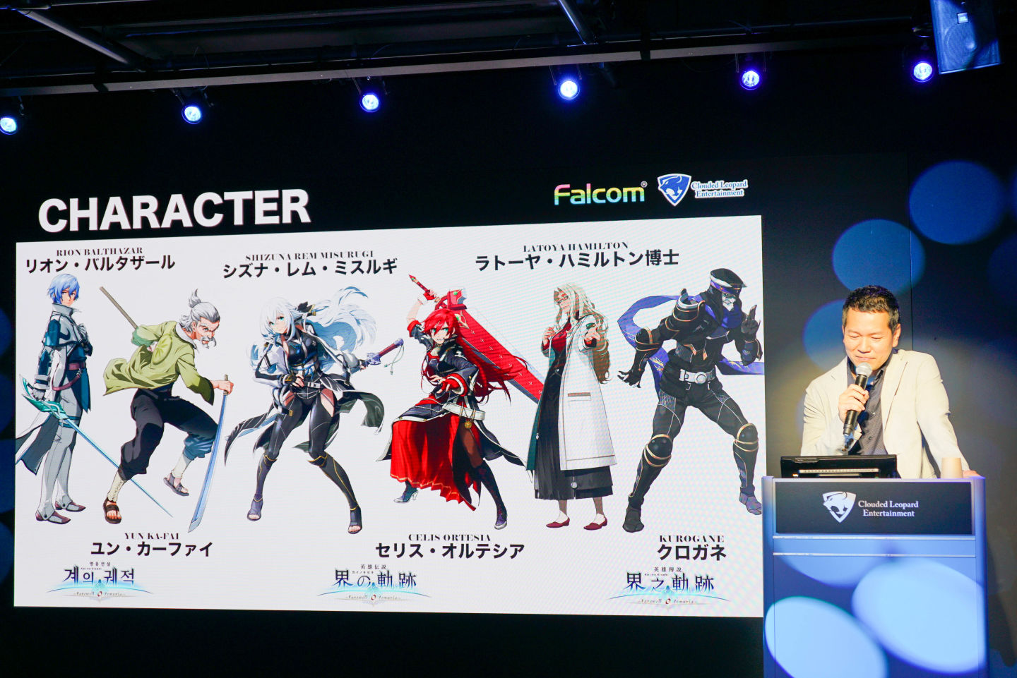 近藤宣布了幾個重要新角色的登場,其中最引人注目的是「八葉一刀流」的雲.卡法伊師傅。「這個角色從《空之軌跡》就有提及,只聞其名不見其人。我們一直在探討適合的登場時機,最早可能在『閃之軌跡』就想讓他出場,但因為角色建模來不及才延後到本作。」