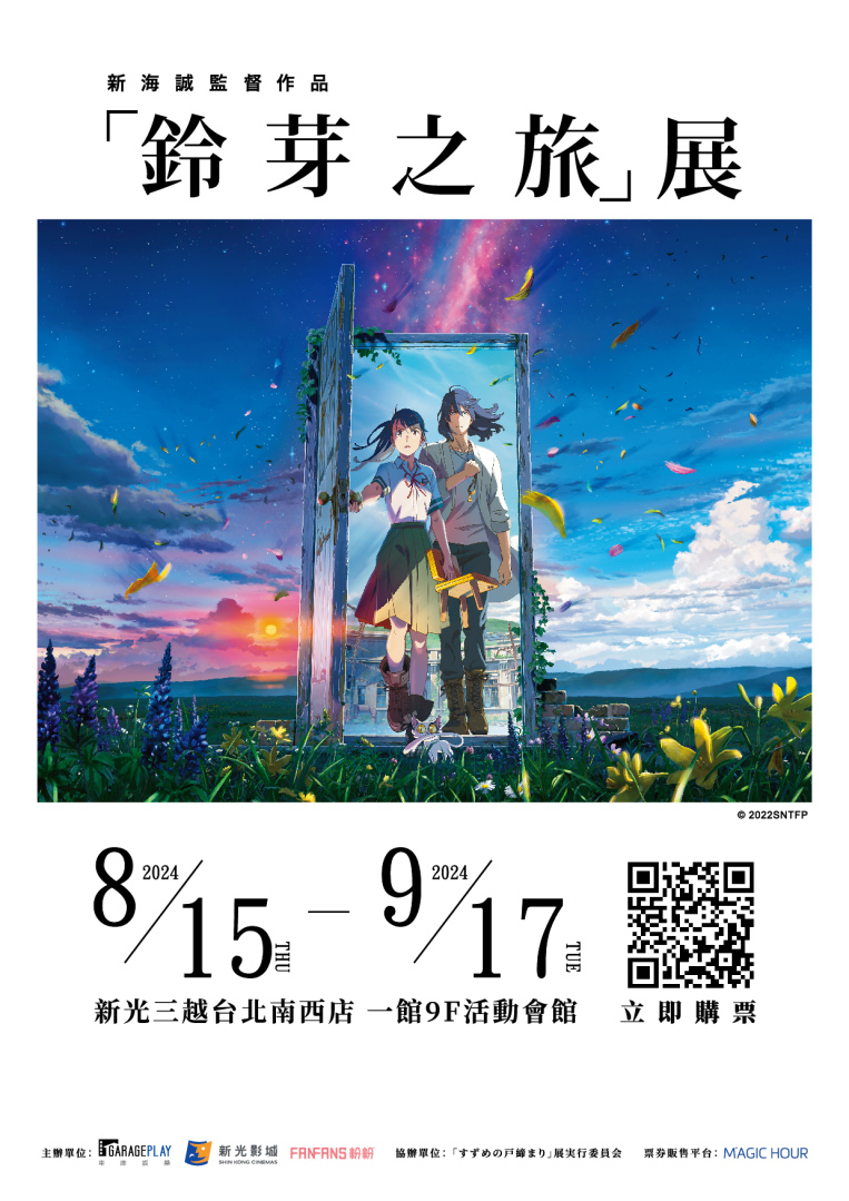 「鈴芽之旅展」台北場將於 8 月 15 日至 9 月 17 日在台北新光三越南西店9樓登場,套票特典項目包含紀念票、典藏畫框、精緻鑰匙掛飾…等多種套票組合供選擇,各款套票數量有限,售完為止。