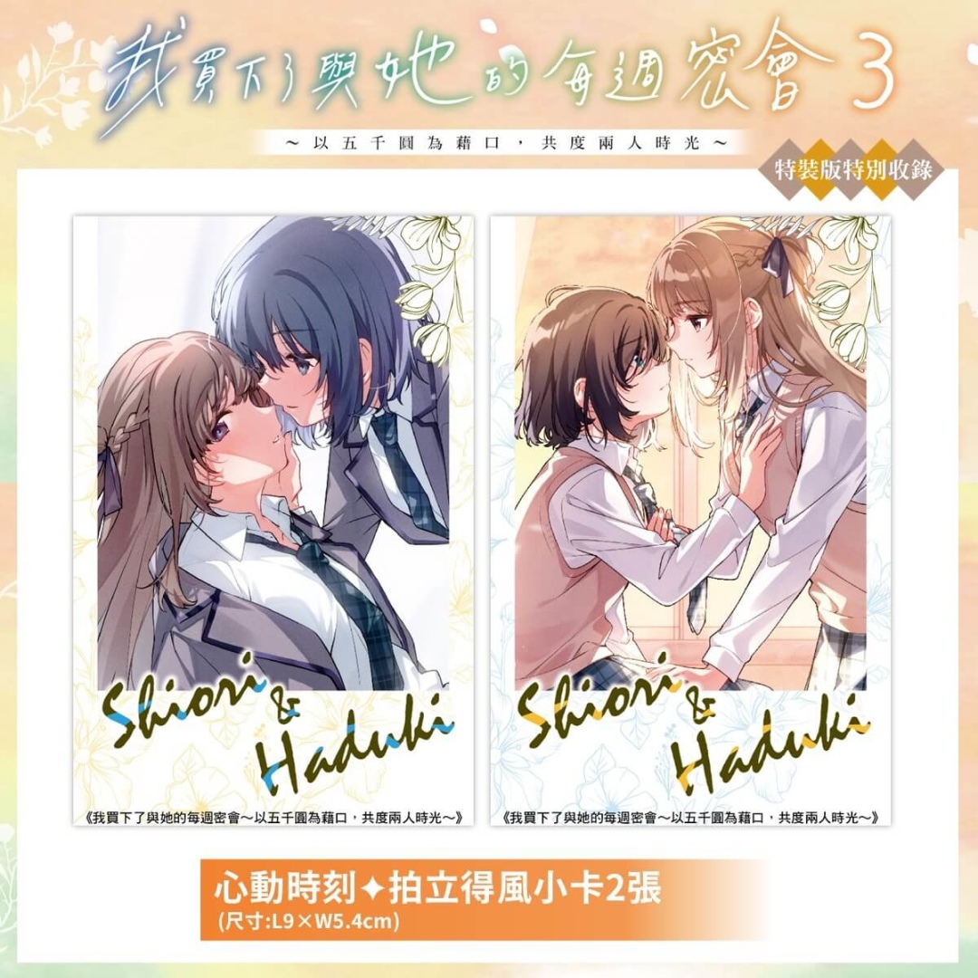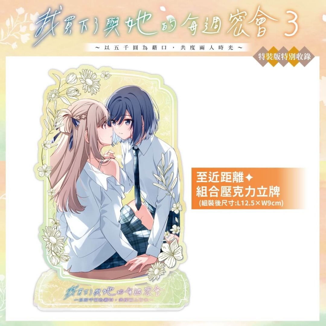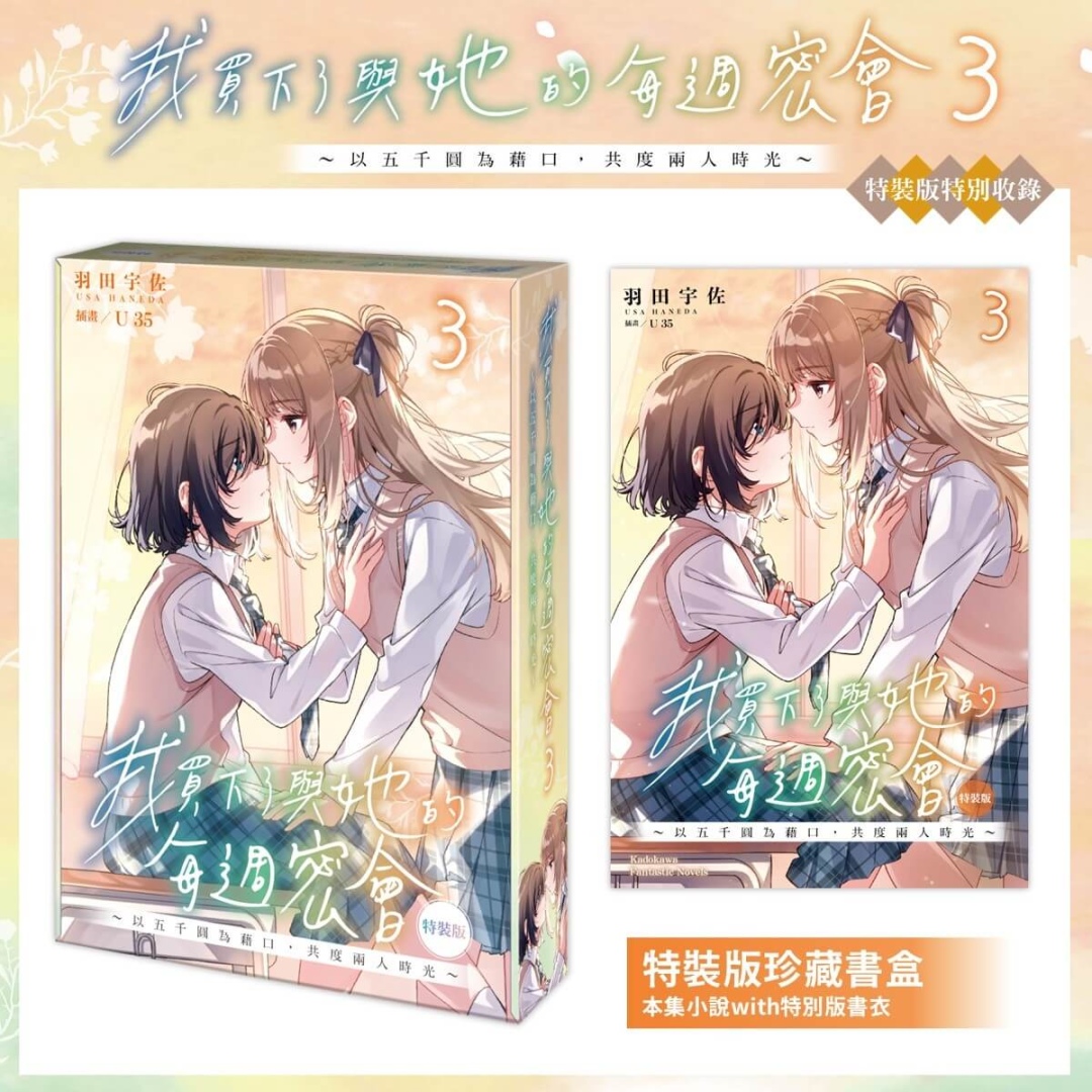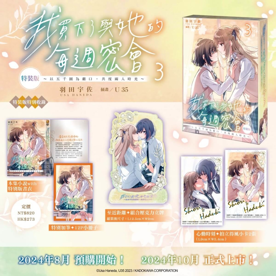 2024 高雄國際動漫節將於 10/10(四)~10/13(日) 雙十連假在高雄巨蛋盛大展出!台灣角川今日公開將於會場首賣的超人氣百合作品:羽田宇佐老師的新作續篇《我買下了與她的每週密會~以五千圓為藉口,共度兩人時光~ (3)》將推出珍藏特裝版,於即日起展開事前預購!可於台灣角川官網及全台指定通路預購至 9/9(一),於官網完成預購再額外加贈官網購物金 100 元。上市後數量有限售完為止,有興趣的讀者請把握預購期間,以免向隅。