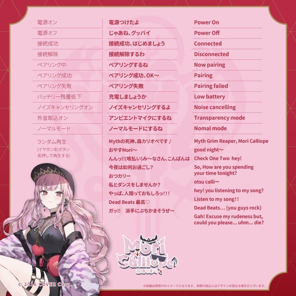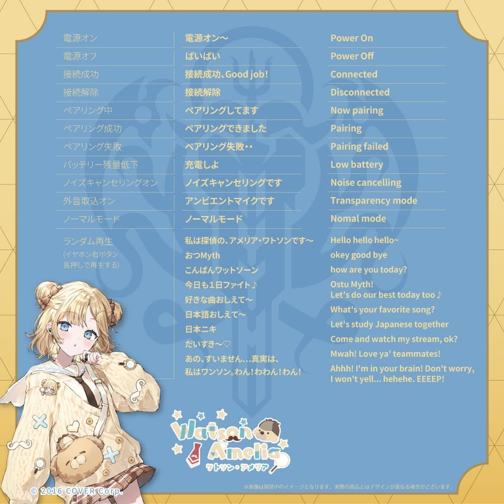 本次推出的聯名商品以 AVIOT 累積出貨量約 13 萬台的熱門「V 系列」的最新機種為基礎所設計,共收錄了 hololive EN 神話組每位成員在日文/英文模式下共 200 多段全新錄製的語音,搭配充電盒外觀和耳機本身的特別設計,讓用戶從打開包裝時起,就能欣賞到全新繪製的華麗插圖。