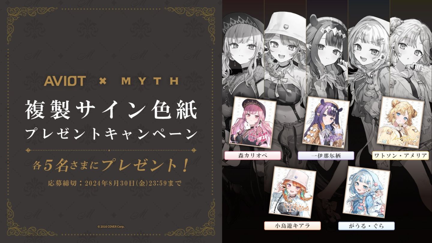 為慶祝 hololive English -Myth- 特別聯名款開放預購,將會舉辦五位成員複製簽名色紙的抽獎活動,此外在 8/23 日起於美國紐約所舉辦的 Anime NYC 2024 活動中,AVIOT 攤位將會為預購該商品的顧客發放特別獎品,想要隨時隨地欣賞神話組全新語音的話趕快到 AVIOT 商品頁面確認吧!