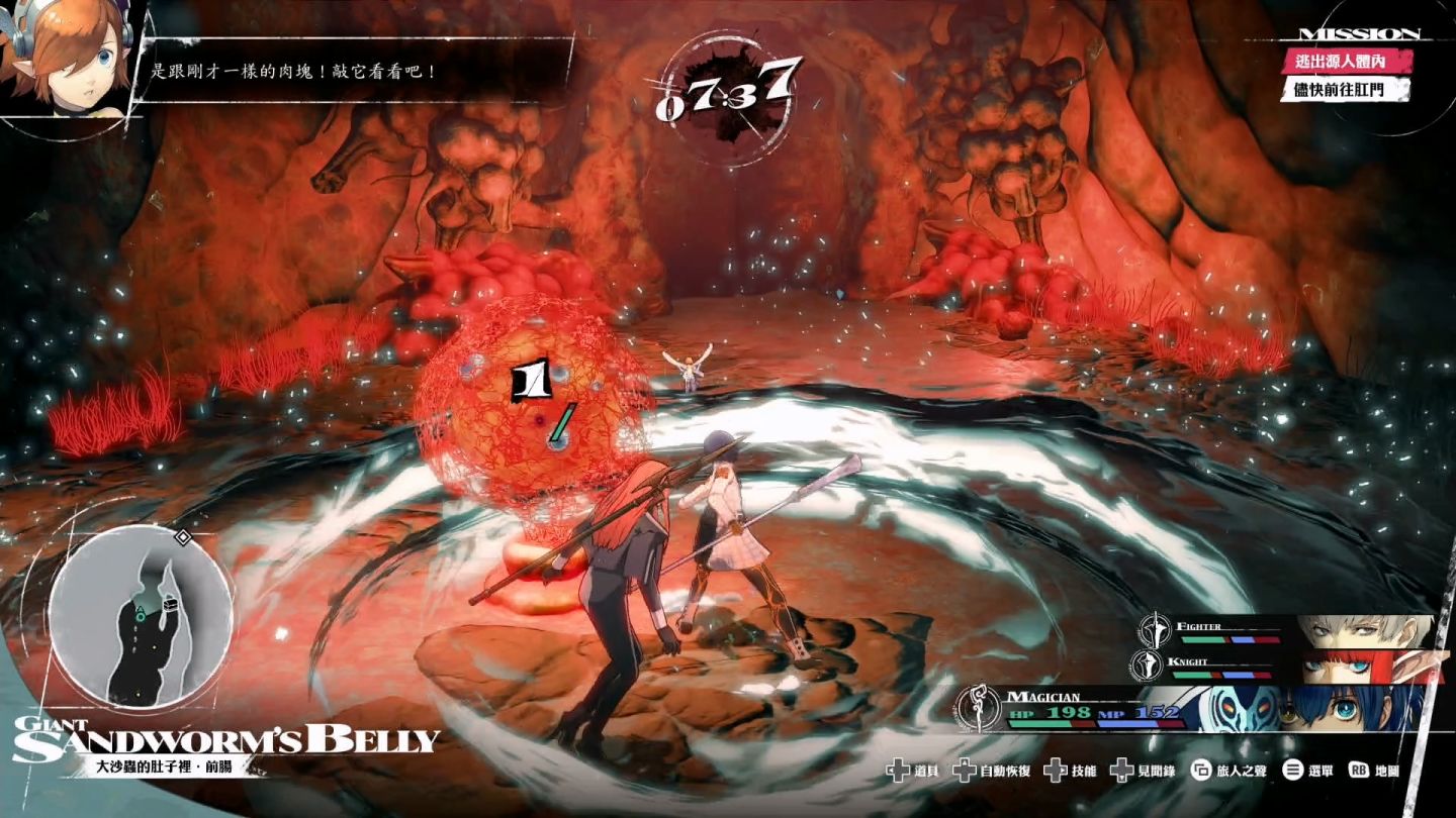 本作的戰鬥中「速戰」與「小隊戰鬥」是主要的兩種模式,速戰是可以對比自己弱的敵人進行秒殺的動作元素,不過這次已經是接近正式版內容,挑戰的沙蟲迷宮都是等級相當的怪物,因此難以體現速戰的便利之處,而且等級在低於挑戰迷宮的怪物時,打起來確實有一點吃力,作為 RPG 還是相當考驗玩家的等級與實力。