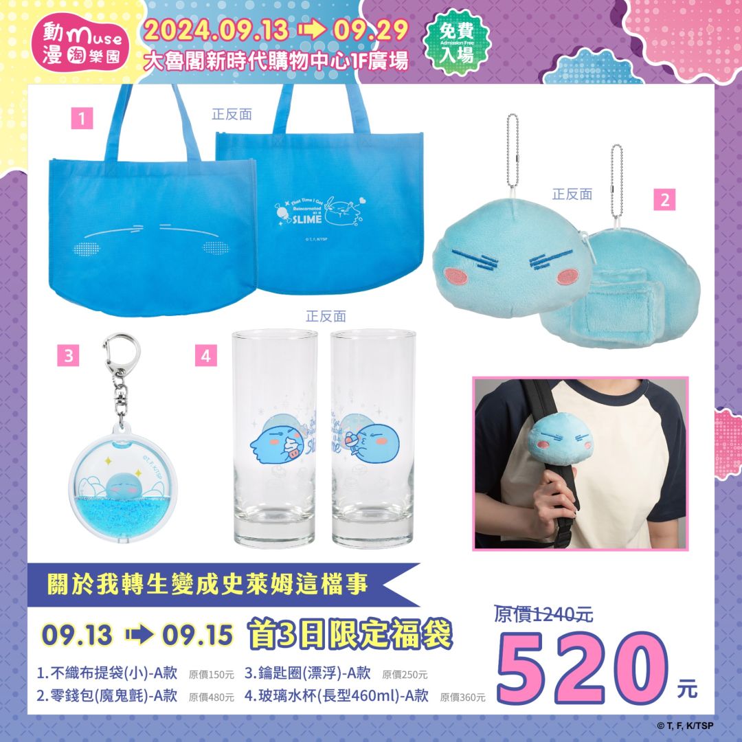 活動首三日 9/13~9/15 特別推出《關於我轉生變成史萊姆這檔事》的期間限定福袋:魔鬼氈絨面史萊姆零錢包、長型史萊姆玻璃水杯、史萊姆大臉表情不織布提袋、史萊姆漂浮鑰匙圈,只要 520 元就可以一次通通帶回家!更加碼推出限定滿額贈,期間單筆消費滿 399 元就可以隨機獲得《鬼滅之刃》禰豆子口罩或善逸眼罩。敬請好好把握首三日的搶購時機!