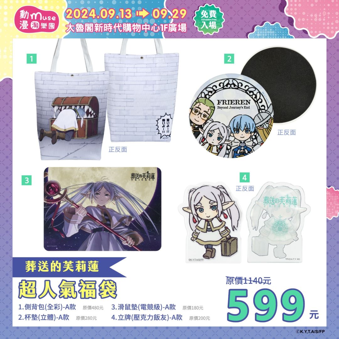精選福袋《WIND BREAKER 防風少年》內容有:風鈴高中校徽徽章、防風鈴圖騰電競滑鼠墊、1000 片拼圖,讓防風少年時時刻刻陪伴在你的生活中;《葬送的芙莉蓮》福袋內容有:電競滑鼠墊、全彩側背包、Q版立體杯墊、壓克力飯友立牌。兩款福袋都只要 599 元就可以帶回家,數量有限要買要快!