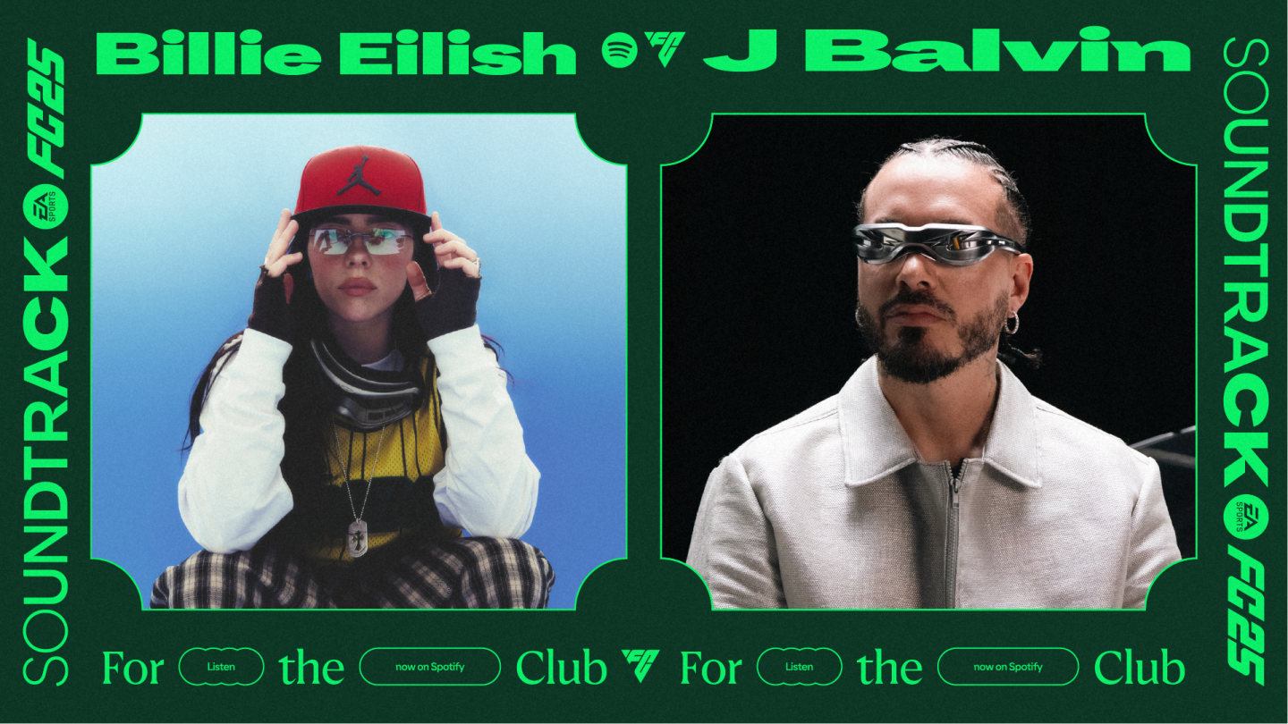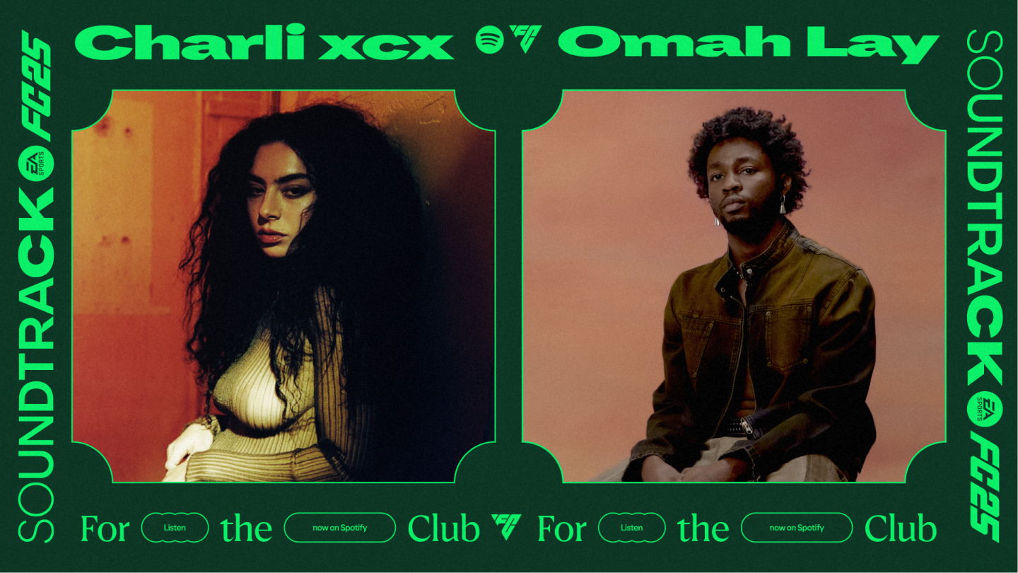 歌曲清單還包括從 Disclosure 與 Ice Spice 到 Kasabian 等一系列國際潮流引領者,以及巨星級的演出者,包括兩屆奧斯卡獎得主 Billie Eilish、雷鬼動(Reggaeton)王子 J Balvin、英國超級製作人 Fred again..、透過廣受好評的專輯【Brat」,引領今年夏天文化個性潮流的 Charli xcx、前景大好的日本 Drill 饒舌歌手 JUMADIBA、無人可匹敵的非洲節奏(Afrobeat)演出者 Obongjayar、西班牙搖滾女團 Hinds,以及著名的叢林音樂復興者 Nia Archives。《FC》忠實粉絲波蘭饒舌歌手 MATA 的全新歌曲也將出現在配樂中,其中《EA Sports FC》將出現在這首歌曲的 MV 內。