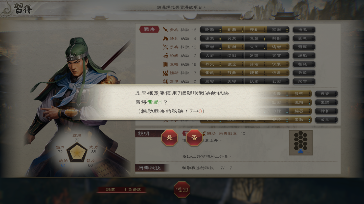 另外,可以在自家進行「訓練」,訓練可以獲得武力、智力等能力的經驗,累積到一定值後能力會上升。都市中,關係為相生的武將若前來「支援」,每次可獲得的經驗將會大幅提升,即便初期能力普通,跟著優秀的夥伴一同努力,也能成為一流的武將。