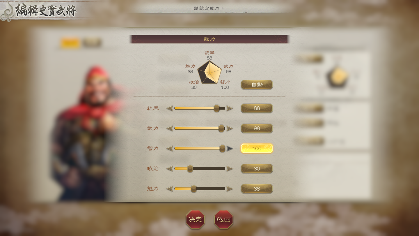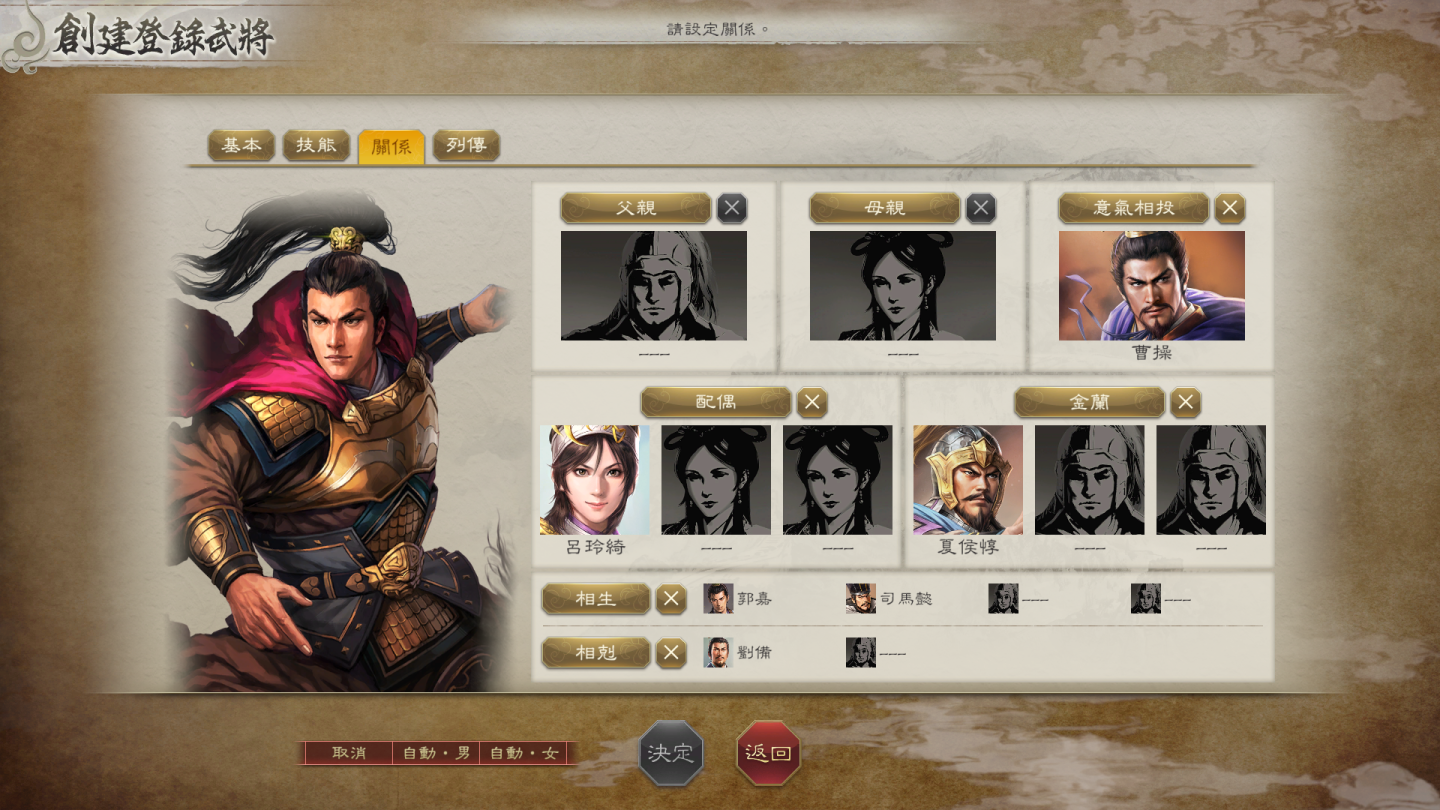 本作也有可編輯史實武將的「編輯史實武將」系統,可以依照自己的喜好調整武將的能力、特技或奇才等,系列慣例的「登錄武將」也可以創建,玩家可以創造自己的分身暢遊三國志的世界,或是製作喜歡的偉人等隨心所欲體驗各種玩法。