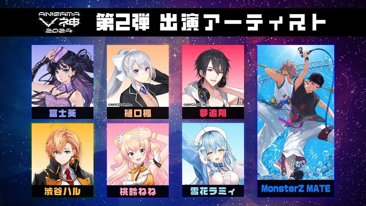 參與本活動的虛擬偶像包括朝之瑠璃/天音彼方/大神澪/周防帕特拉/緋月ゆい/YuNi/V.W.P(花譜、理芽、春猿火、ヰ世界情緒、幸祜)/富士葵/樋口楓/夢追翔/澀谷HAL/MonsterZ MATE/桃鈴音音/雪花菈米。