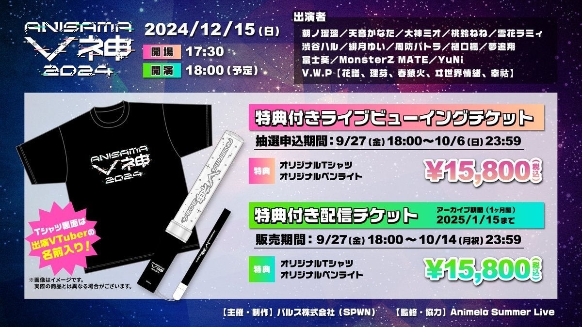 日本 Balus 宣布,自 9 月 27 日起開始販售日本最大動畫歌曲音樂節「Animelo Summer Live」預定在 12 月 15 日首次舉辦的虛擬演唱會表演「ANISAMA V神 2024」門票,屆時除了戲院觀賞以外還能在 SPWN 直播平台上收看。