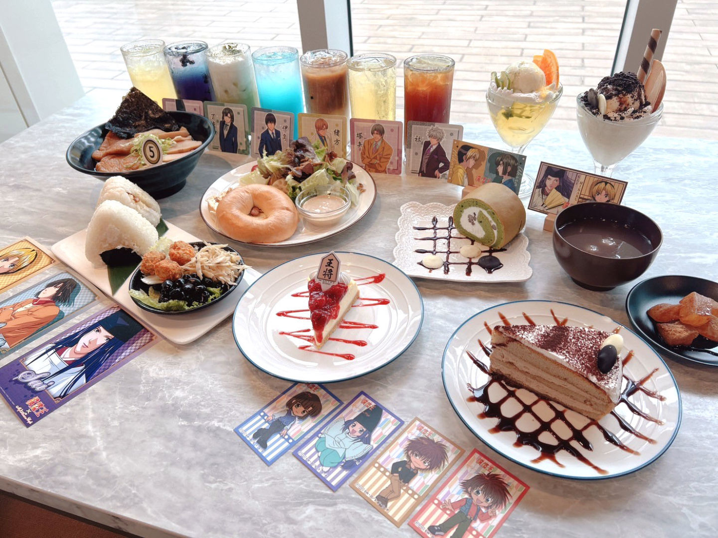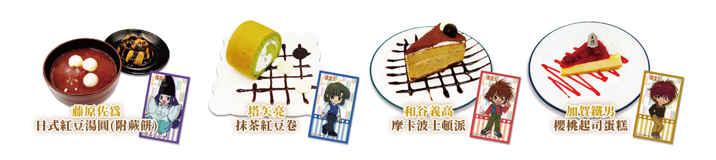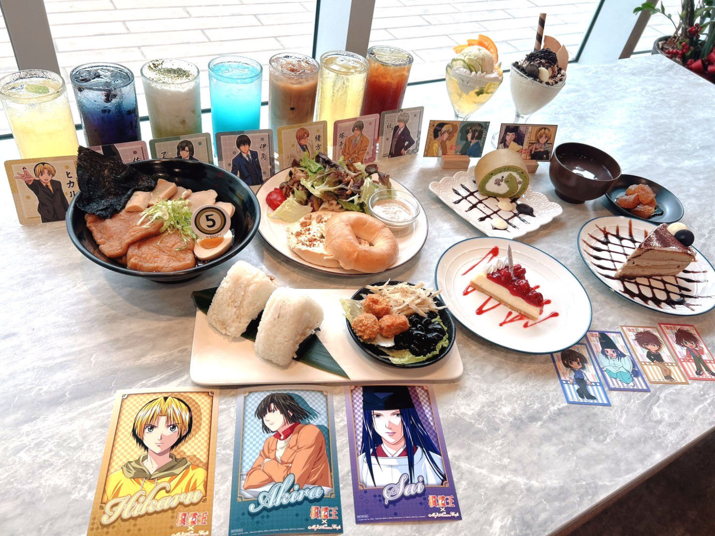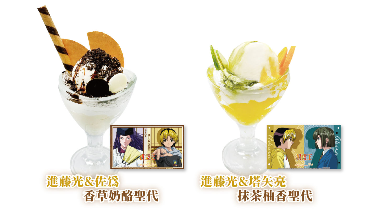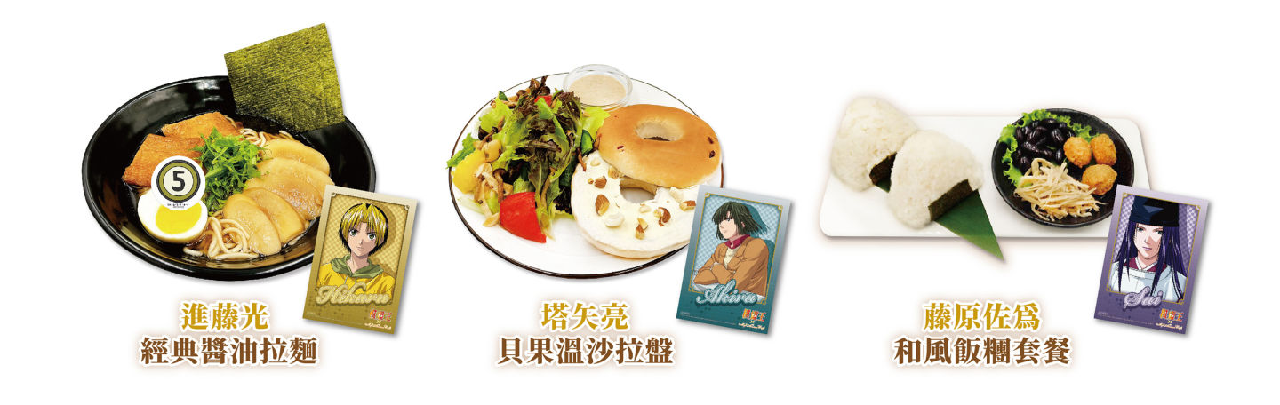 《棋靈王》主題 Café 與創意蔬食料理結合,提供美味健康兼具餐點,本次首推特色餐點「進藤光的經典醬油拉麵」,在阿光喜愛的拉麵上也能看見 T 恤上的 5,相當具有代表性。聖代則有夥伴組:阿光與佐為的「香草奶酪聖代」,以及對手組:阿光與亮的「抹茶柚香聖代」,每一口品嚐都是三人共同前進的美好時光。甜點則有西式及和風的選擇,搭配 Q 版角色特典讓人耳目一新。飲料則推出 10 杯以角色印象設定的飲品,同時兼顧青少年組及成人組的支持族群,給粉絲更多樣的選擇。
