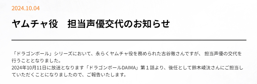 本消息在 10/4 由動畫《七龍珠 DAIMA》官方社群及古谷徹所屬之經紀公司青二 Production 官網一同公布,《七龍珠 DAIMA》接下來將在 10/11 首播,觀眾可從第一集就聽到由鈴木崚汰聲演的飲茶。