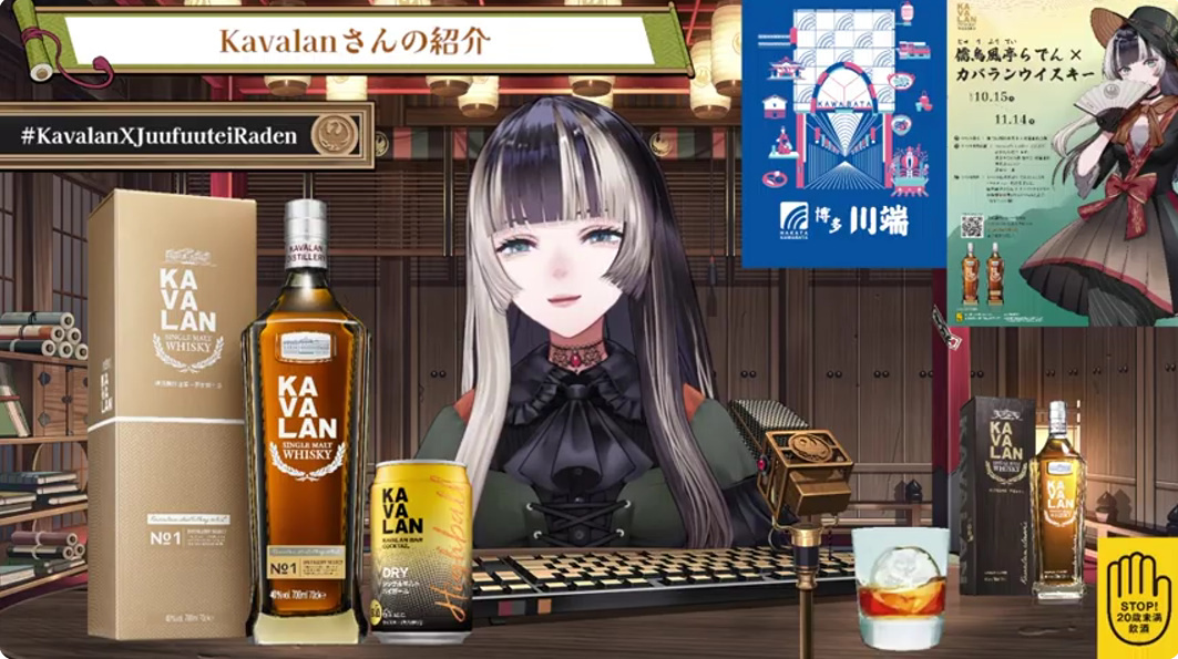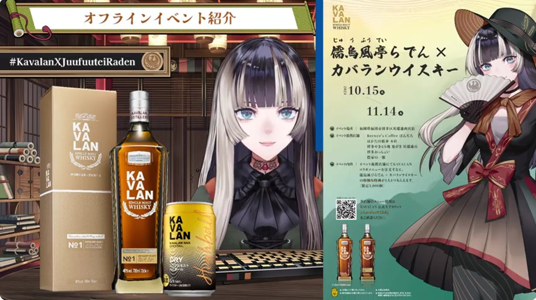 來自台灣的知名威士忌品牌「噶瑪蘭威士忌」(Kavalan Single Malt Whisky)於今(9)日宣布,和虛擬偶像事務所 hololive production 旗下團體 ReGLOSS 成員「儒烏風亭螺鈿」(儒烏風亭らでん)將從 10 月 15 日起至 11 月 14 日展開限期合作。