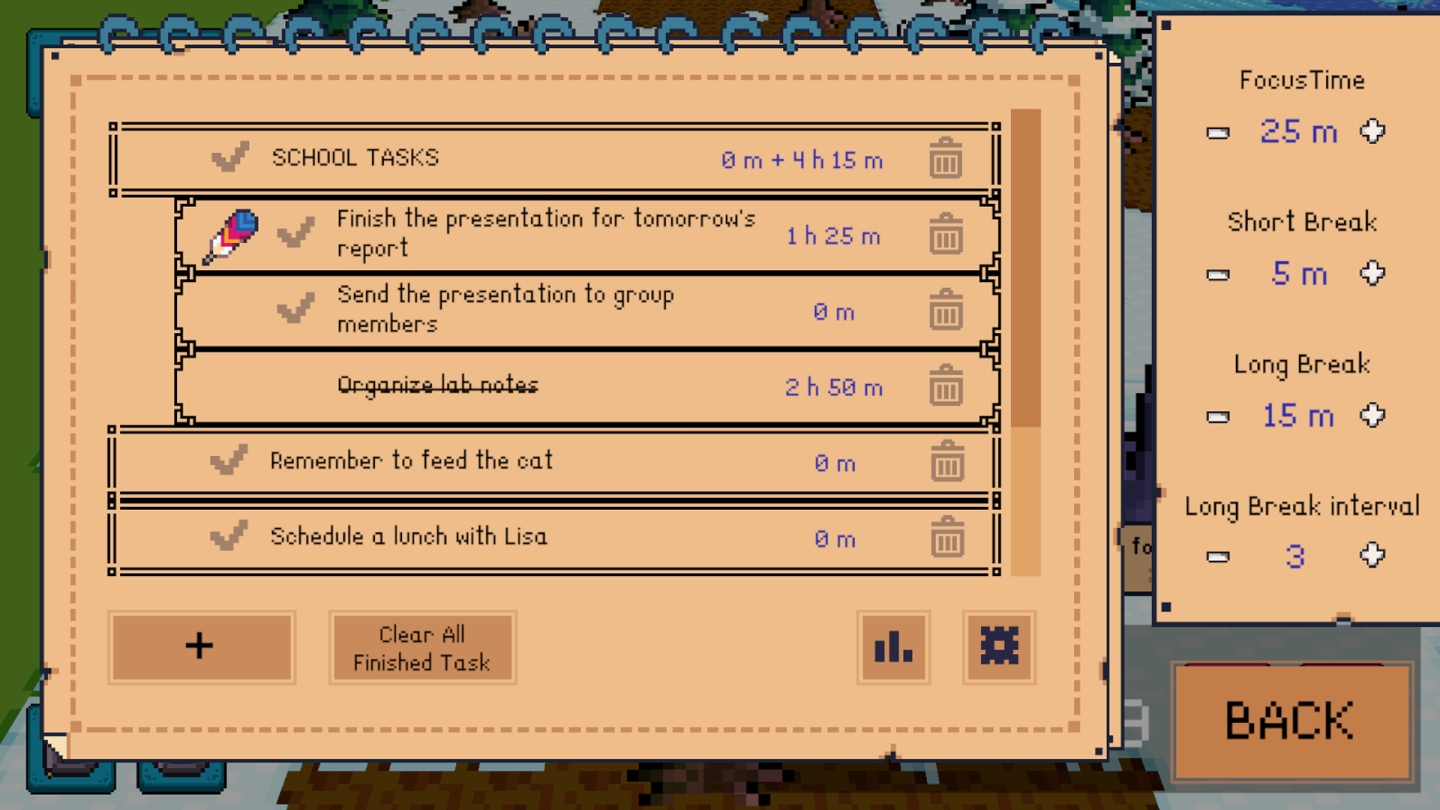 另外,遊戲中提供了很方便的任務清單,除了支持多層任務分類外,也會紀錄單一任務的專注累積時間。