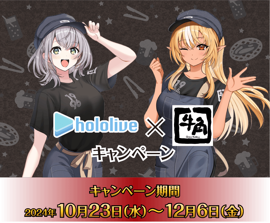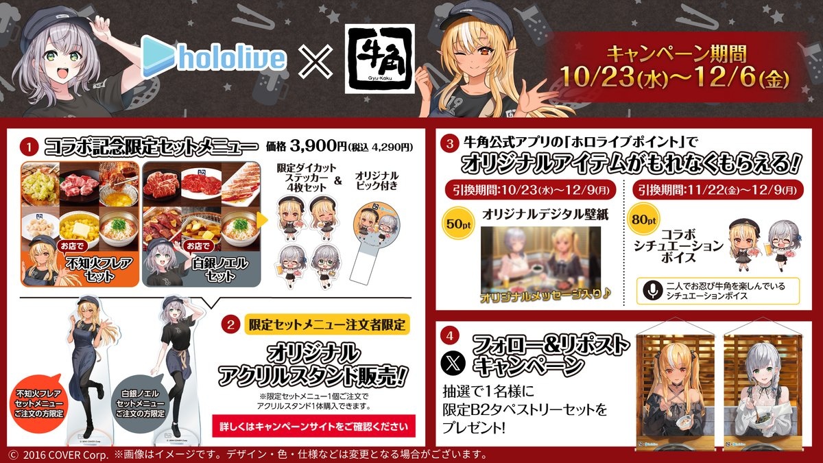 活動期間若使用牛角官方 APP 結帳的話,即可賺取帳單的2%作為 hololive 點數,並以此點數兌換限定景品,包含原創留言的數位桌布和聯名限定情境語音;此外追蹤日本牛角官方 X(原推特)帳號並轉發指定貼文者,將會從中抽出一位幸運兒,可獲得團長與阿火的 B2 掛軸,喜歡銀火組合的粉絲們不要錯過!