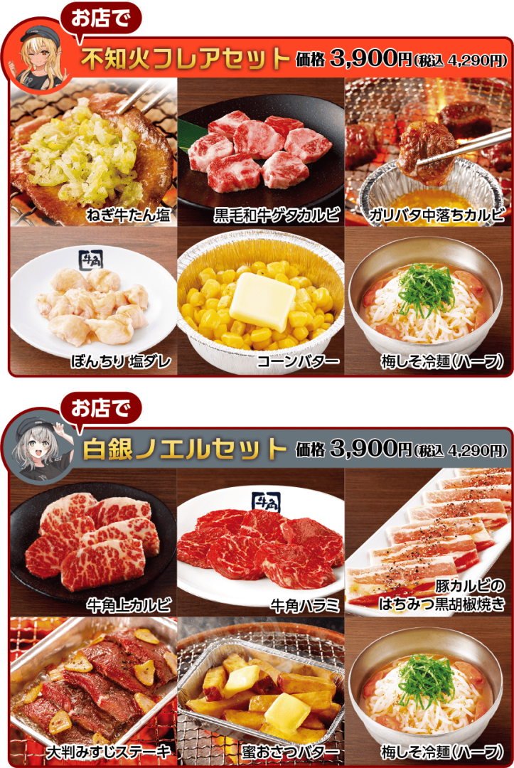 本次合作中將推出由白銀諾艾爾和不知火芙蕾雅兩人精選菜色所組成的特別套組(阿火套組:蔥鹽牛舌/黑毛和牛牛肋條/香蒜奶油口味牛肋條/鹽醬口味雞屁股/奶油玉米/紫蘇梅子口味冷麵半份,團長套組:上等五花肉/橫膈膜/蜂蜜黑胡椒口味豬五花/板腱牛排/蜂蜜奶油地瓜/紫蘇梅子口味冷麵半份),凡是選購上述套餐者可獲得限定合作貼紙套組與紙卡,還能加價購買限定原創壓克力立牌。