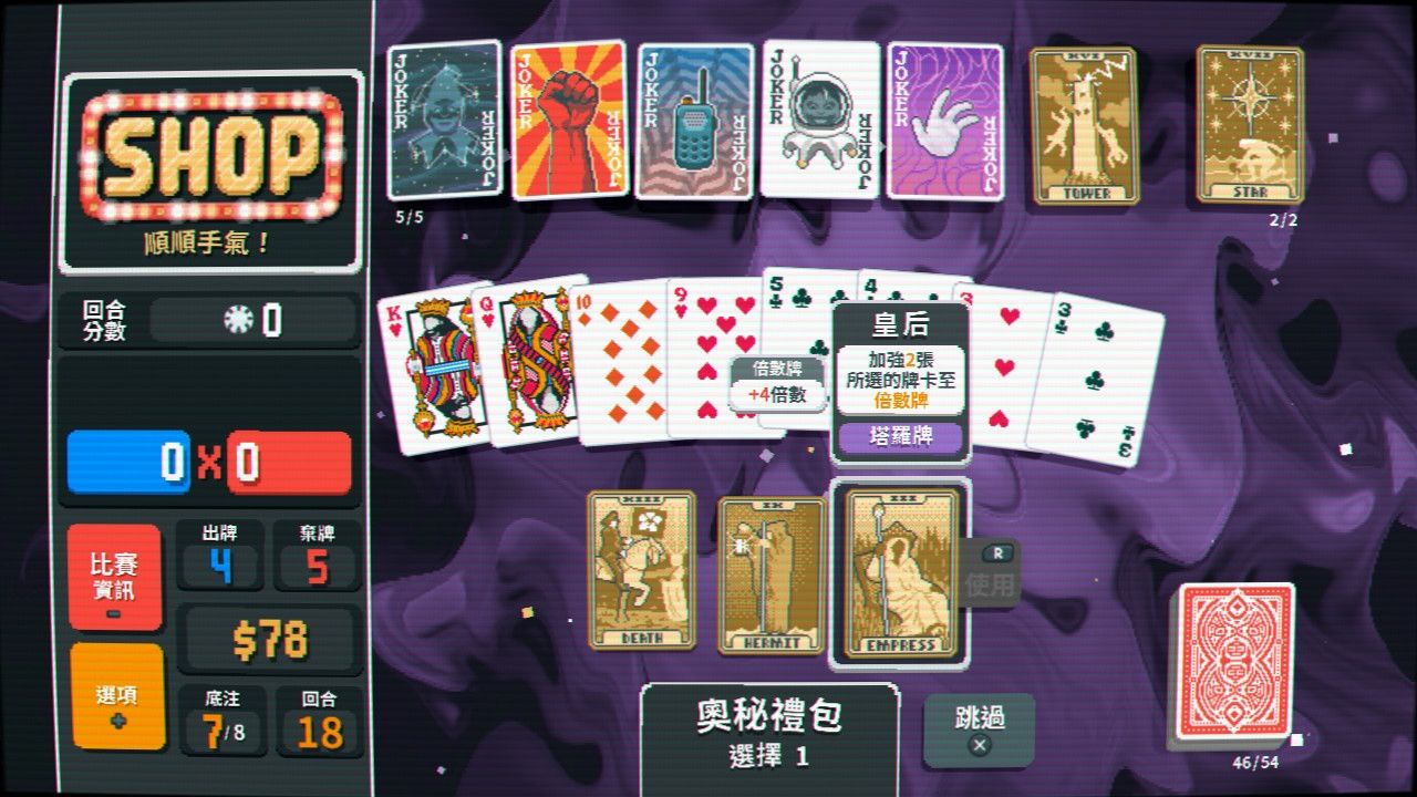 巧妙部署各式牌組、小丑牌、塔羅牌、行星牌、幻靈牌,以及禮券等等多不勝數。利用這些功能牌觸發威力強大的 Combo,增強你的出牌實力,享受令人腎上腺素飆升的牌局吧!