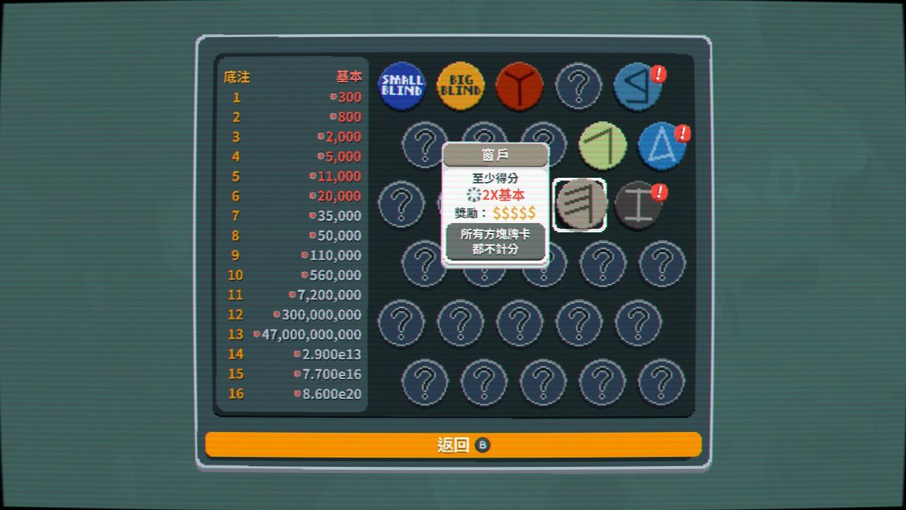將有效的牌型組合與獨特的小丑牌結合,就可以創造出各種連鎖特殊效應和構築牌組。賺取足夠的籌碼來通過盲注關卡,隨著牌藝日漸精進,發現隱藏的獎金手牌和牌組。絞盡腦汁、發揮所有優勢,才能晉級到魔王級 Boss 盲打關卡,贏取最終賭注、穩贏勝利。