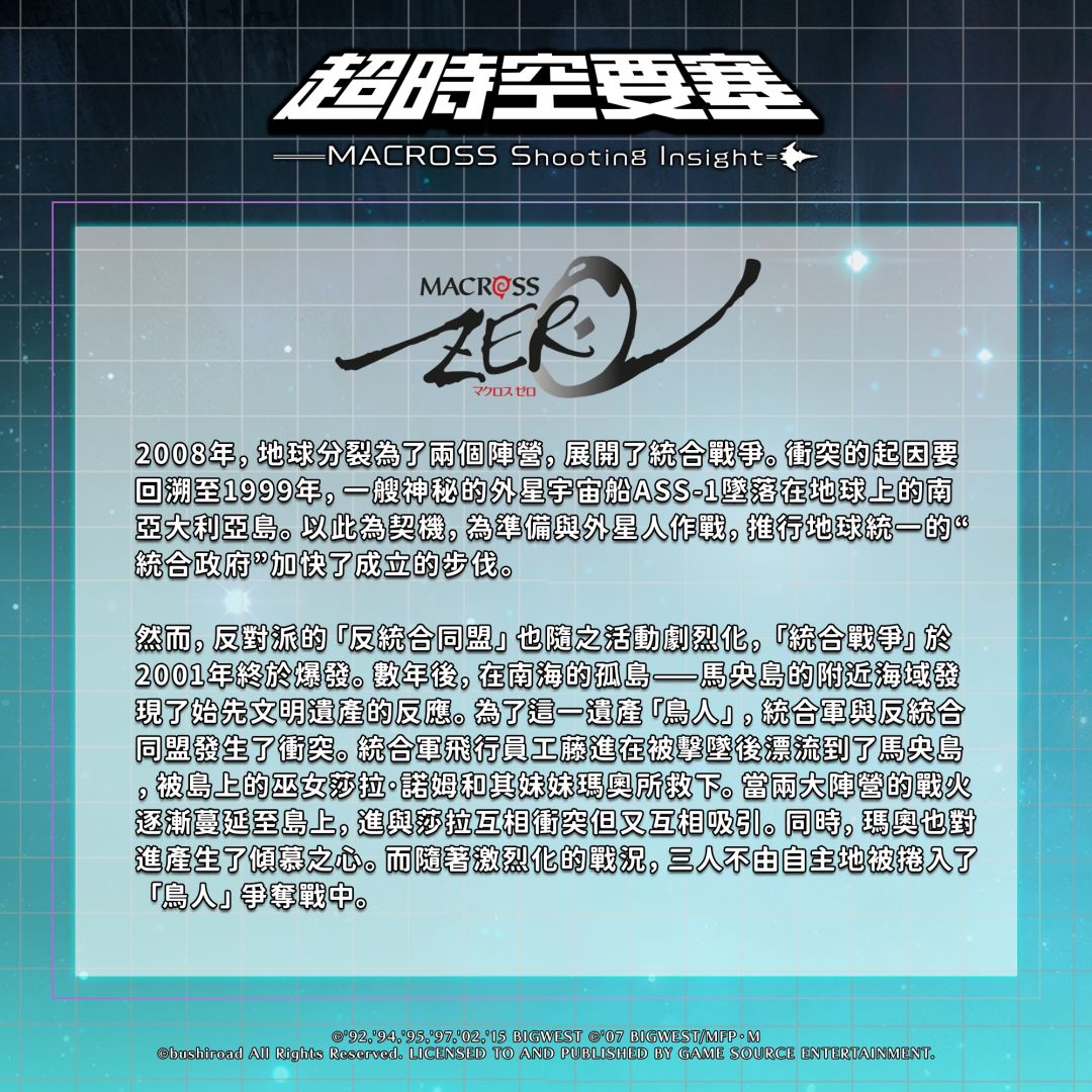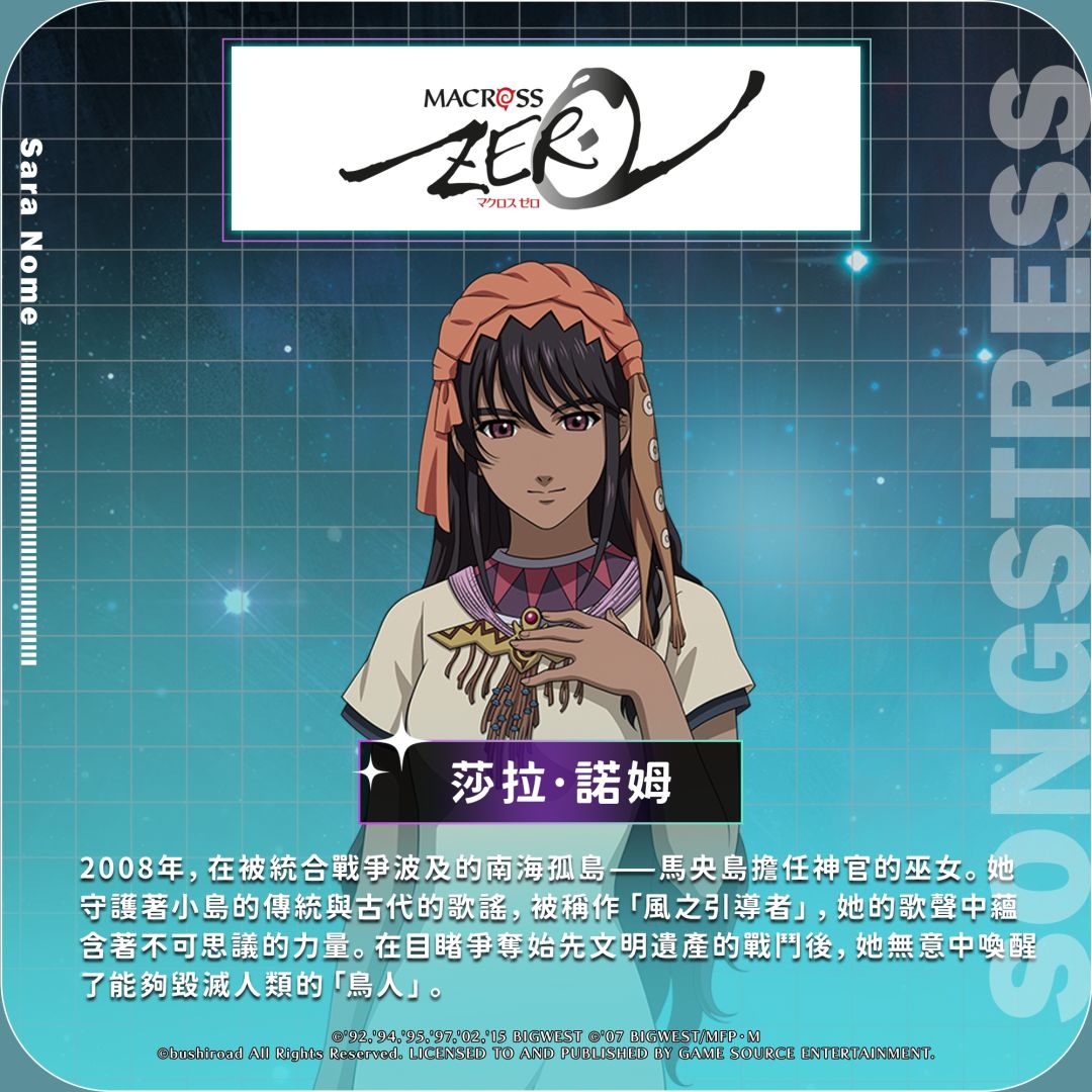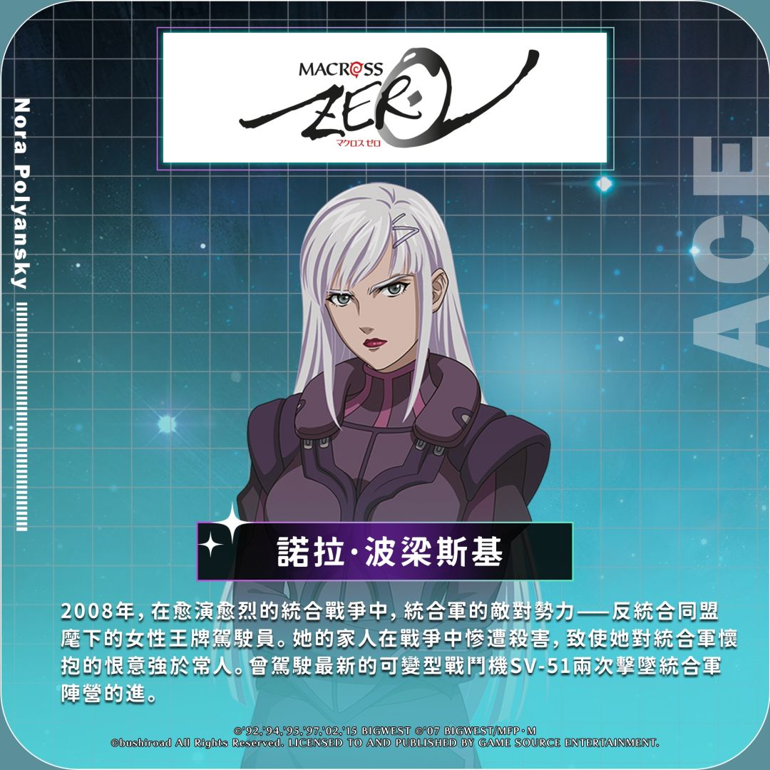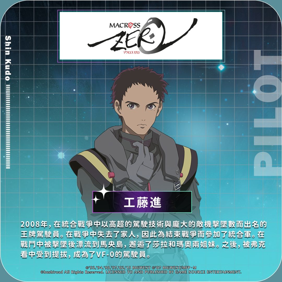作品以主艦「戰鬥艦7號」為舞台,來自《超時空要塞》5 部動畫作品登場之 39 名角色,展開跨越系列的原創故事。今天將為各位介紹來自作品《超時空要塞 Zero(Macross Zero)》的主要登場角色!