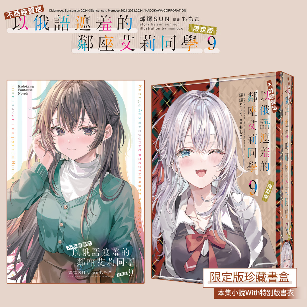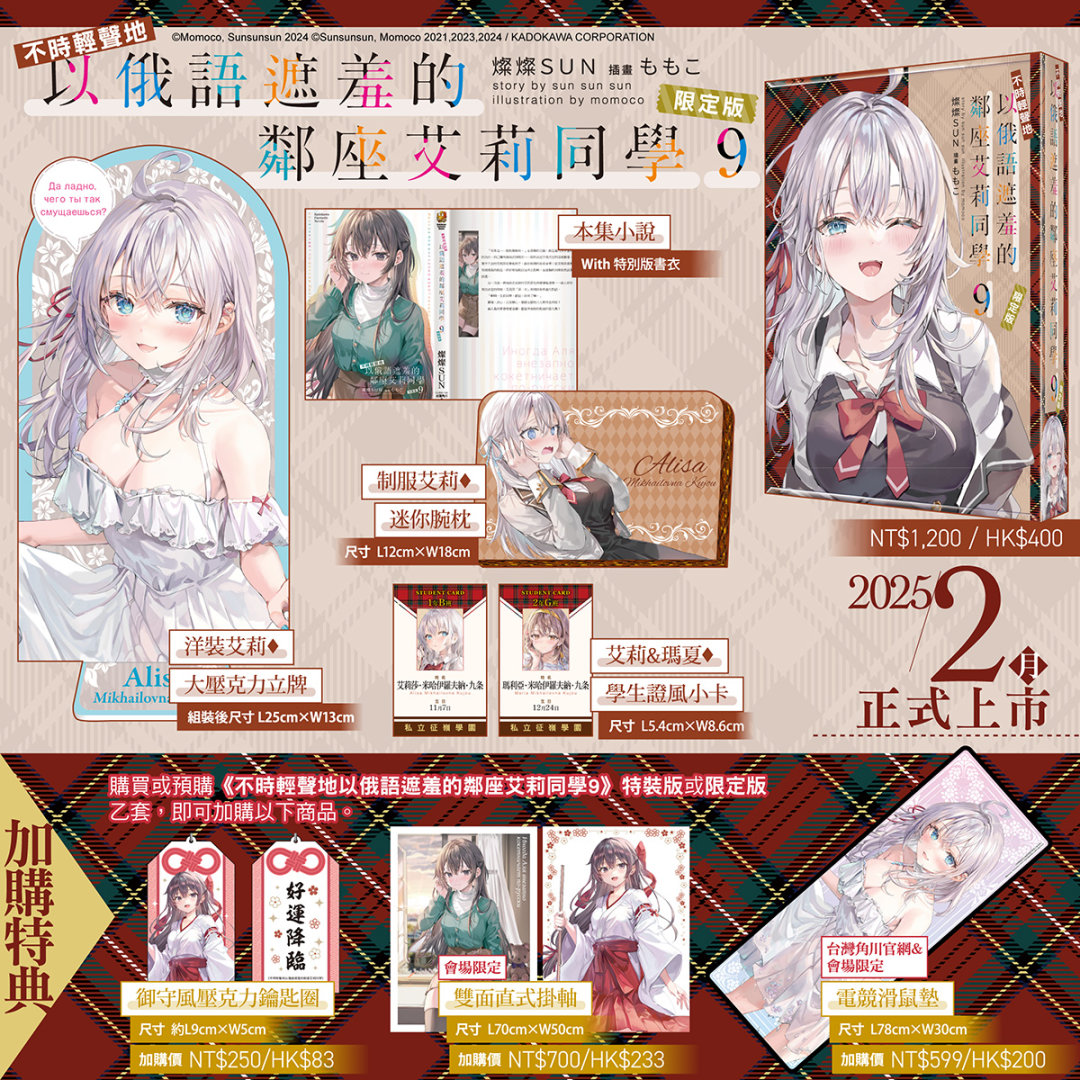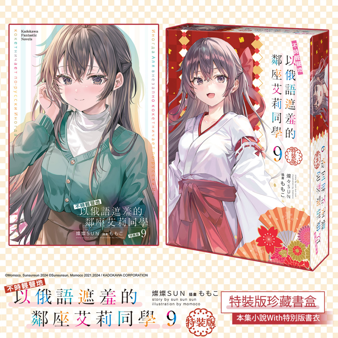 台灣角川宣布,將於 2025 台北國際動漫節推出《不時輕聲地以俄語遮羞的鄰座艾莉同學》第 9 集,並同步推出含書籍精品與加價購的限定與特裝雙版本,限定版僅於台灣角川會場與官網販售,特裝版則將於全通路販售,並於即日起開放特裝版限期事前預購。