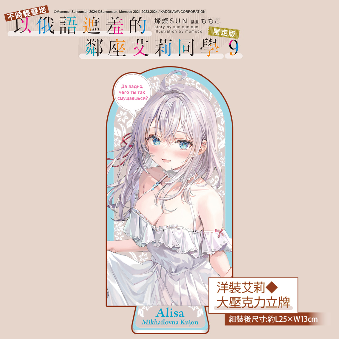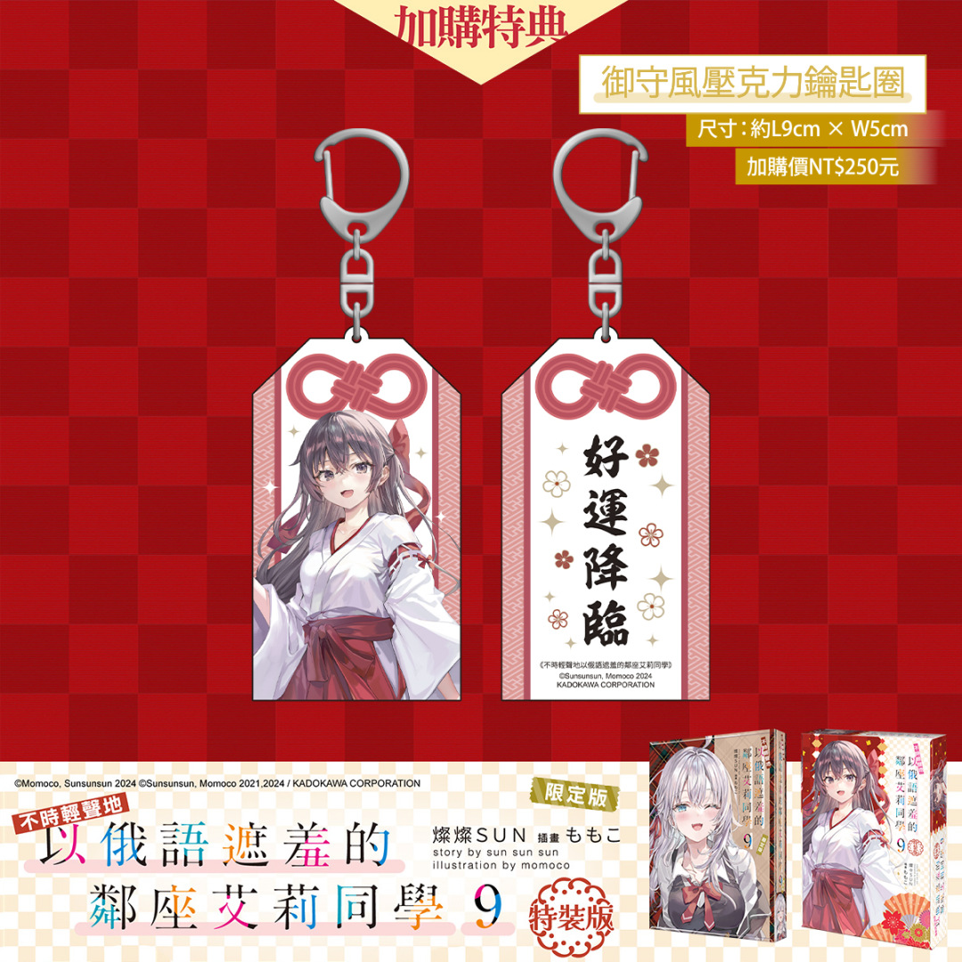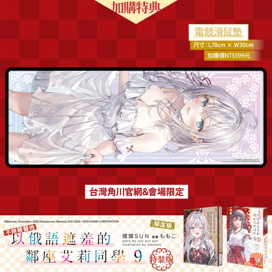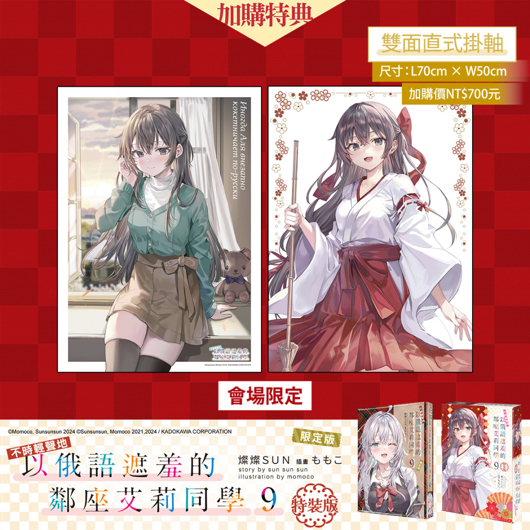 台灣角川宣布,將於 2025 台北國際動漫節推出《不時輕聲地以俄語遮羞的鄰座艾莉同學》第 9 集,並同步推出含書籍精品與加價購的限定與特裝雙版本,限定版僅於台灣角川會場與官網販售,特裝版則將於全通路販售,並於即日起開放特裝版限期事前預購。