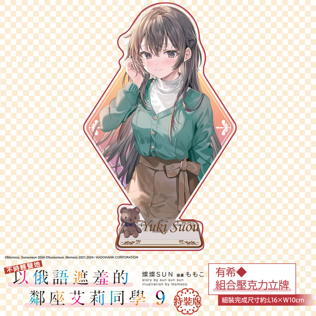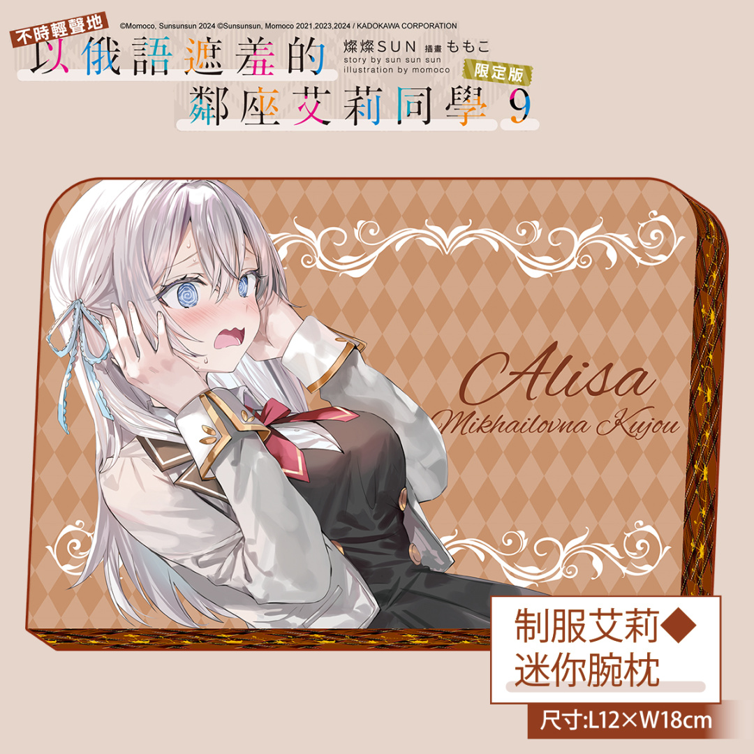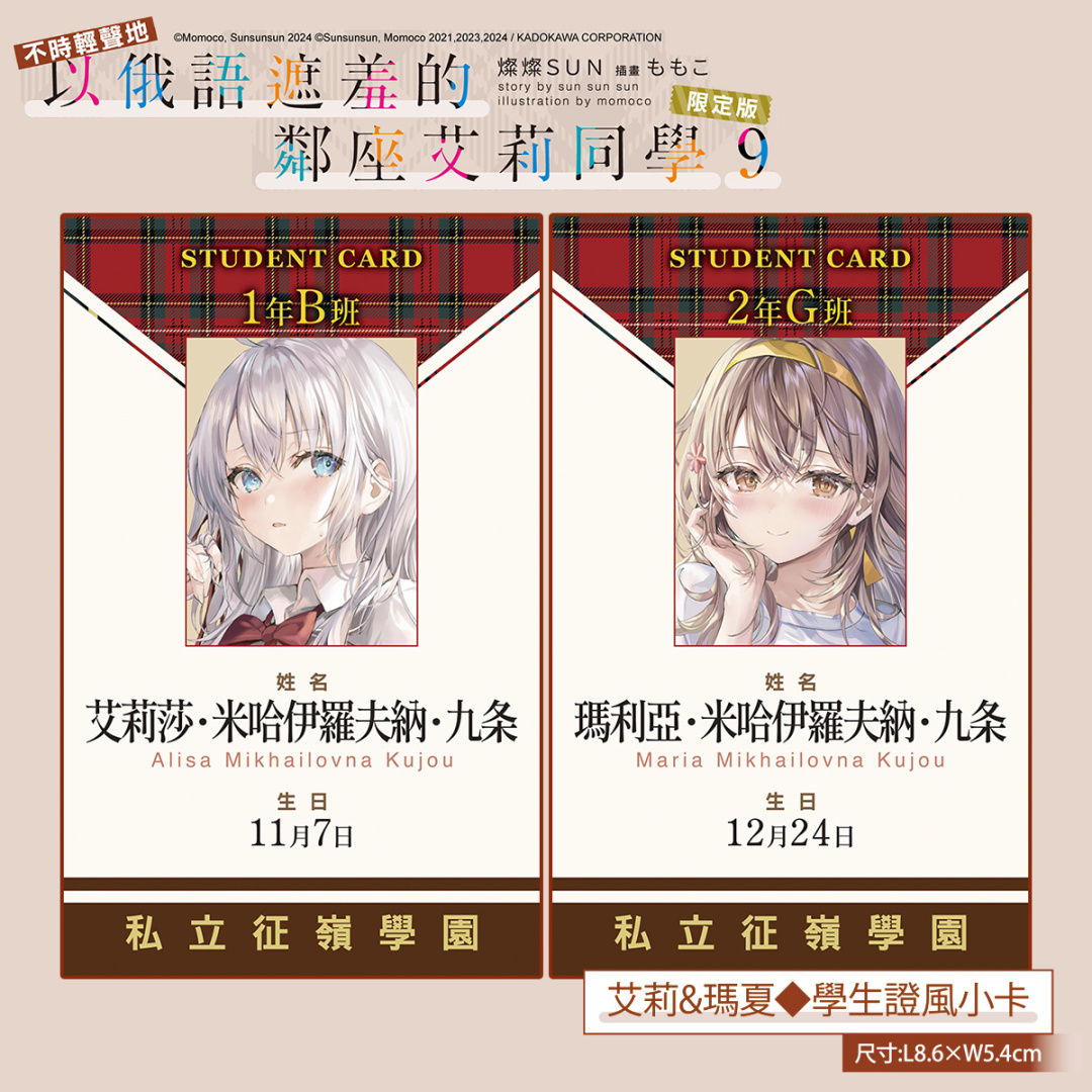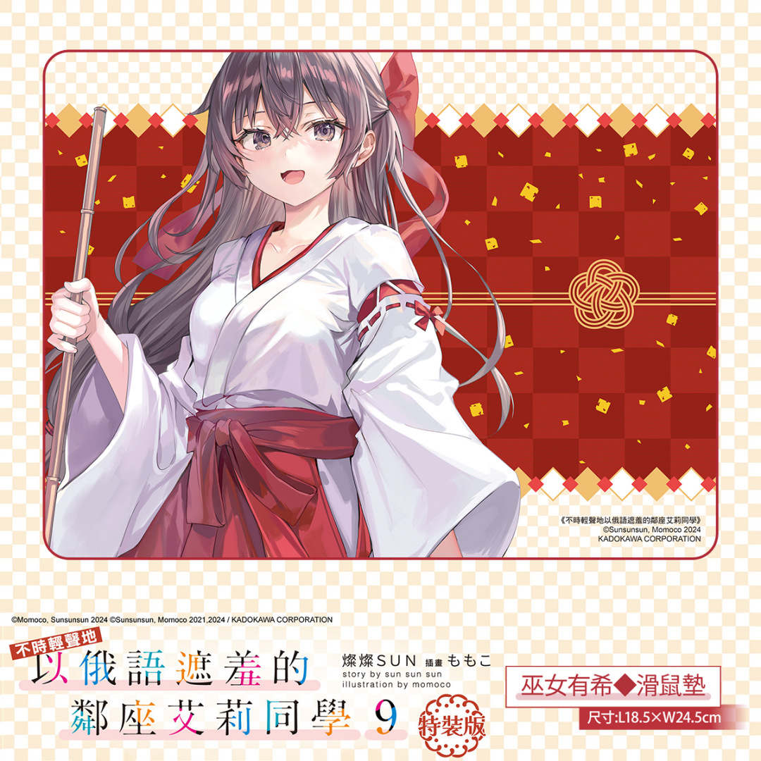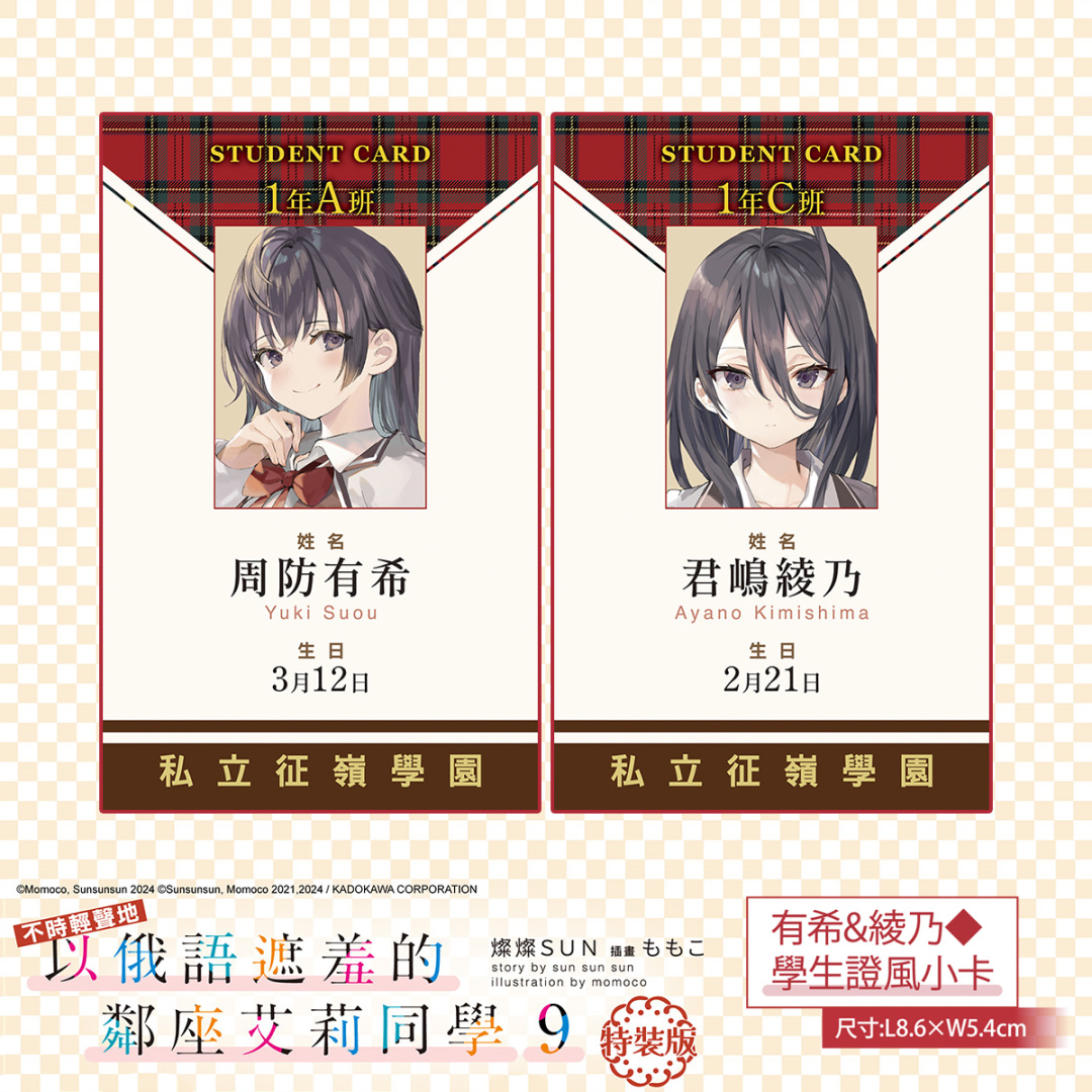 這次《不時輕聲地以俄語遮羞的鄰座艾莉同學 (9)》限定版收錄特典:「洋裝艾莉◆大壓克力立牌」、「制服艾莉◆迷你腕枕」、「艾莉&瑪夏◆學生證風小卡」;特裝版特典:「有希◆組合壓克力立牌」、「巫女有希◆滑鼠墊」、「有希&綾乃◆學生證風小卡」,雙版本皆收錄「本集小說 With 特別設計書衣」及「珍藏書盒」。