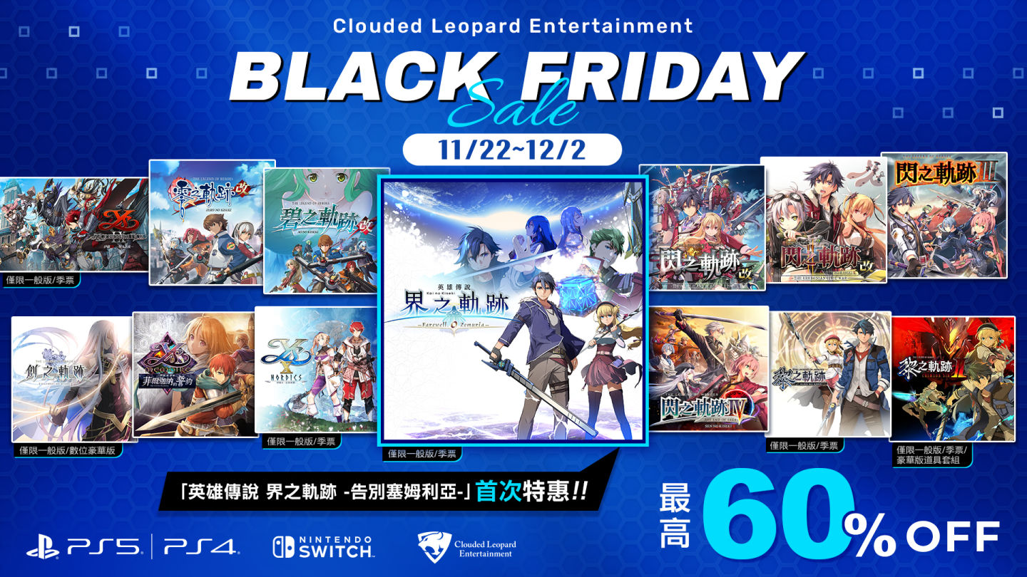 雲豹娛樂今日(11月22日)宣布,至 12 月 2 日止,展開「CLE BLACK FRIDAY SALE 2024」年度特賣活動。涵蓋多款經典遊戲,還包括備受期待的二十週年紀念作品《英雄傳說 界之軌跡 -告別塞姆利亞-》首次特價。