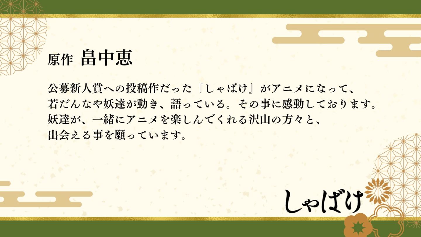 作者畠中恵在評論中表示《娑婆氣》是參加新人獎公開徵集的作品,現在要改編成動畫,能看到少爺和妖怪們會動會說話的模樣讓他非常感動,飾演一太郎的山下大輝則表示主角身邊的妖怪們都很有魅力,能在這些妖怪的幫助下嘗試破解謎團,並在幽默和懸疑之間取得絕妙的平衡,認為這是一部值得男女老少觀賞的精彩作品敬請期待。