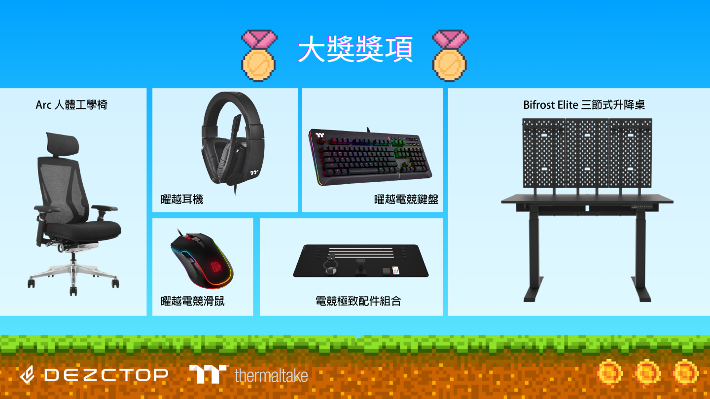 「Indie Game 集點遊樂園」大獎獎項由升降桌椅品牌「DEZCTOP」、電競硬體品牌「曜越科技」贊助。本次 G-EIGHT 獨立遊戲展,玩家在指定活動攤位體驗遊戲,即可參加「Indie Game集點遊樂園」,集滿點數後參加抽獎,有機會抽到 BifrostElite 三節式升降桌、Arc 人體工學椅、電競極致配件組合、曜越電競鍵盤、曜越電競耳機、曜越電競滑鼠.....等多重好禮,還有機會抽到遊戲,官方希望玩家來展覽體驗完,回家接著玩!