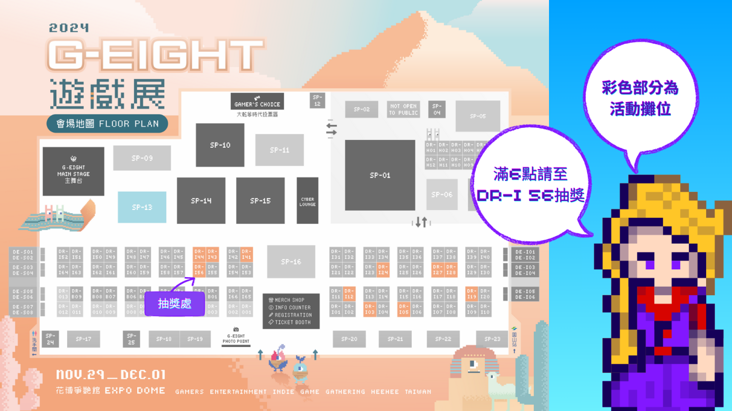 「Indie Game 集點遊樂園」在 G-EIGHT 獨立遊戲展,指定活動攤位與遊戲名單如下:
