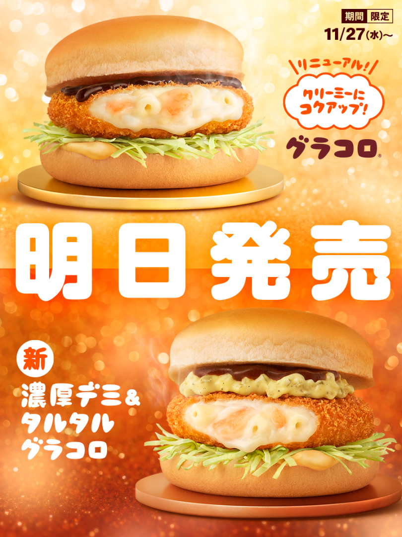 自 1993 年起開賣的可樂餅漢堡對日本人來講可說是冬天定番,充滿焗烤餡料的可樂餅、搭配新鮮高麗菜與特製多蜜醬的組合相當受歡迎,今年更首次對可樂餅進行改版,成功研發出最適合可樂餅的濃厚起司風味。