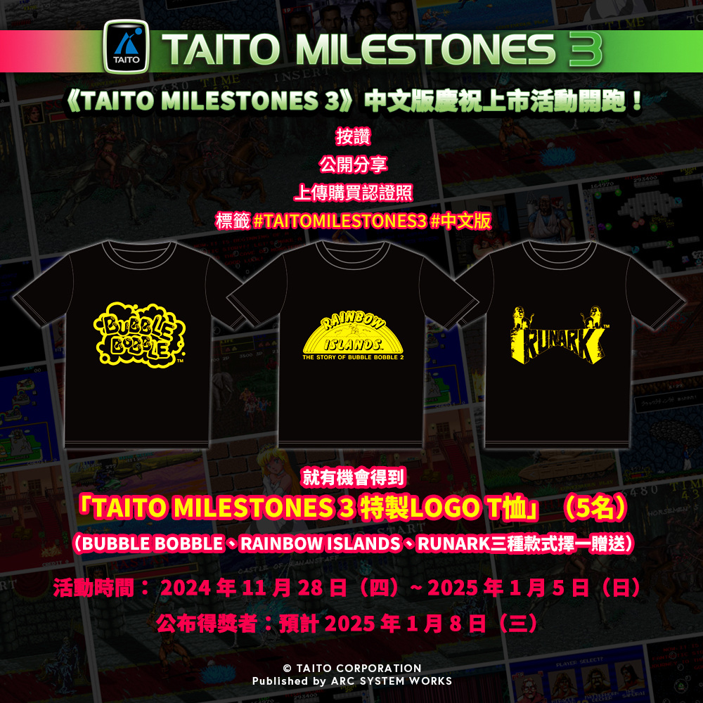 為慶祝中文版上市,從今天起舉辦抽獎活動。公開上傳購買認證照或是遊玩遊戲的畫面並留下關於本作的感想,就有機會得到由《Bubble Bobble》、《Rainbow Islands》、《Runark》三種遊戲主題設計而成的「Taito Milestones 特製 Logo T恤」其中一款。
