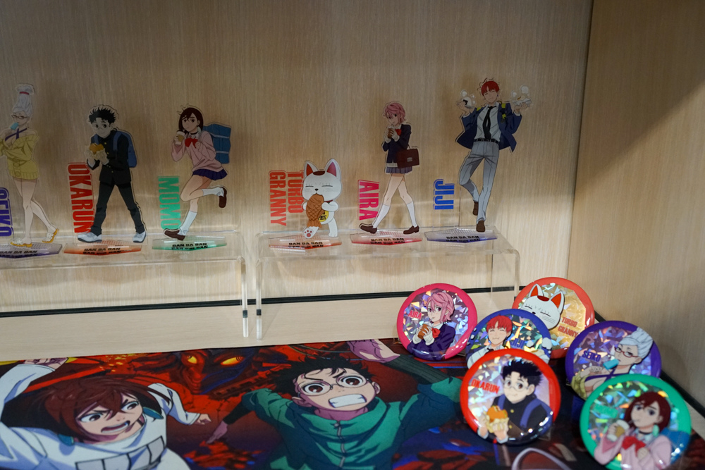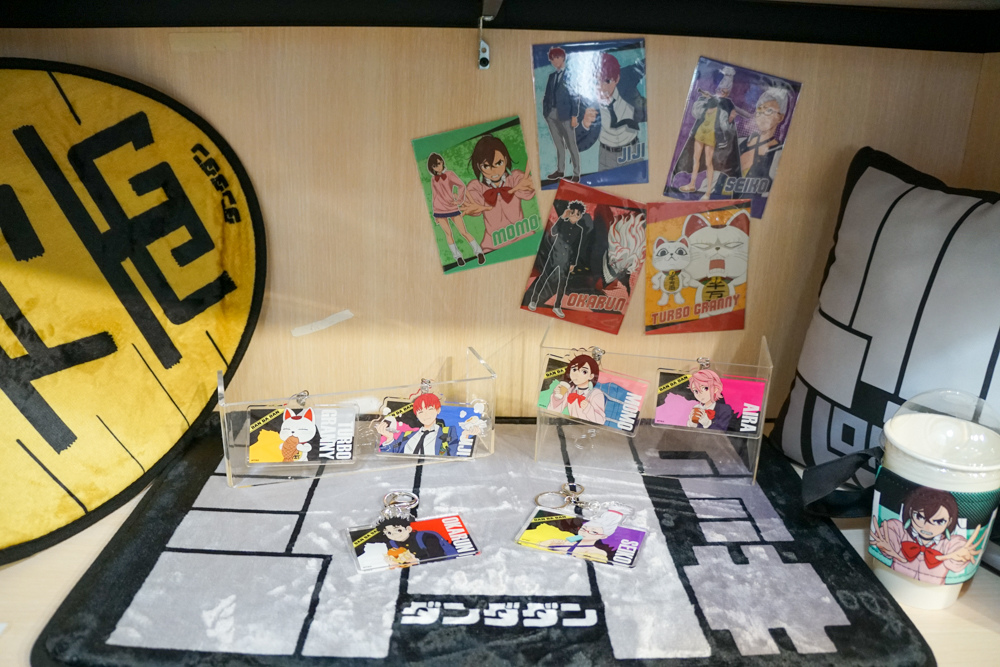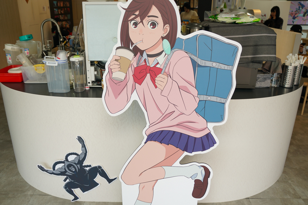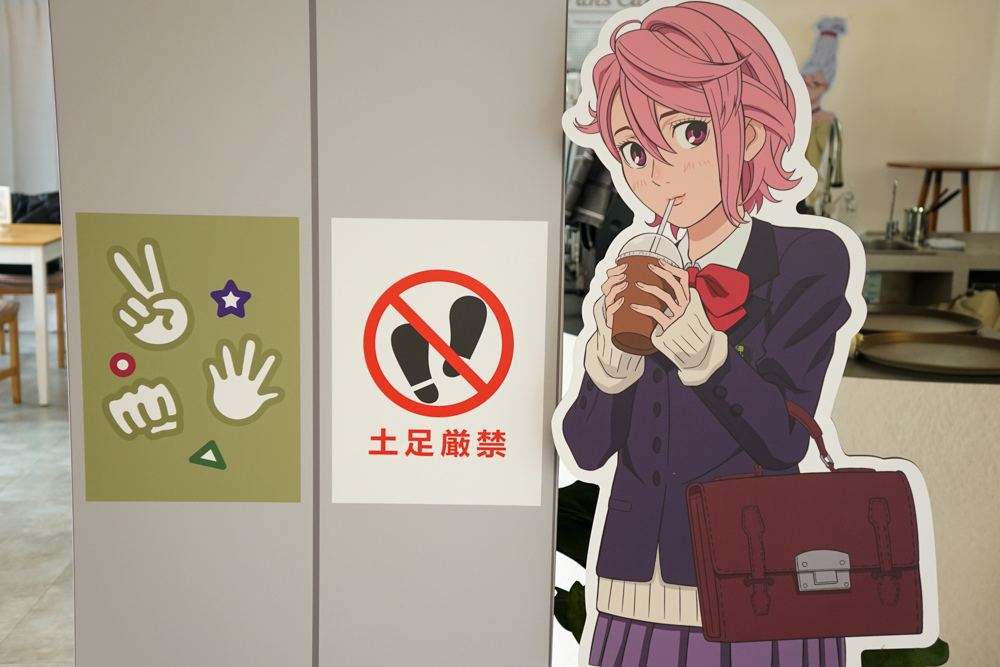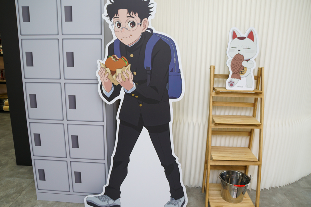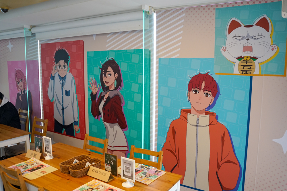 店內設有小桃、厄卡倫、愛羅、星子、寺仁的 1:1 角色立牌及場景窗貼,營造繽紛的用餐氛圍。台北店打造校園教室情景,粉絲可坐在小桃與厄卡倫中間拍照留念;台中店則重現小桃和厄卡倫搭乘電車的經典場景,提供絕佳的打卡機會。