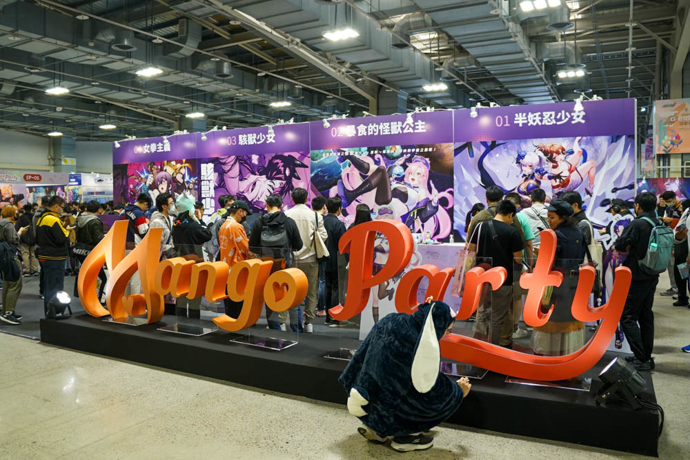 芒果派對更在場外設置了等身比例模型,包含《女拳主義》的凱婷、《怠惰的怪獸公主》的卡歐,以及《夏色四葉草》的靜子,供玩家拍照留念。此外,還原了這些遊戲的經典場景原畫等開發素材展示。。